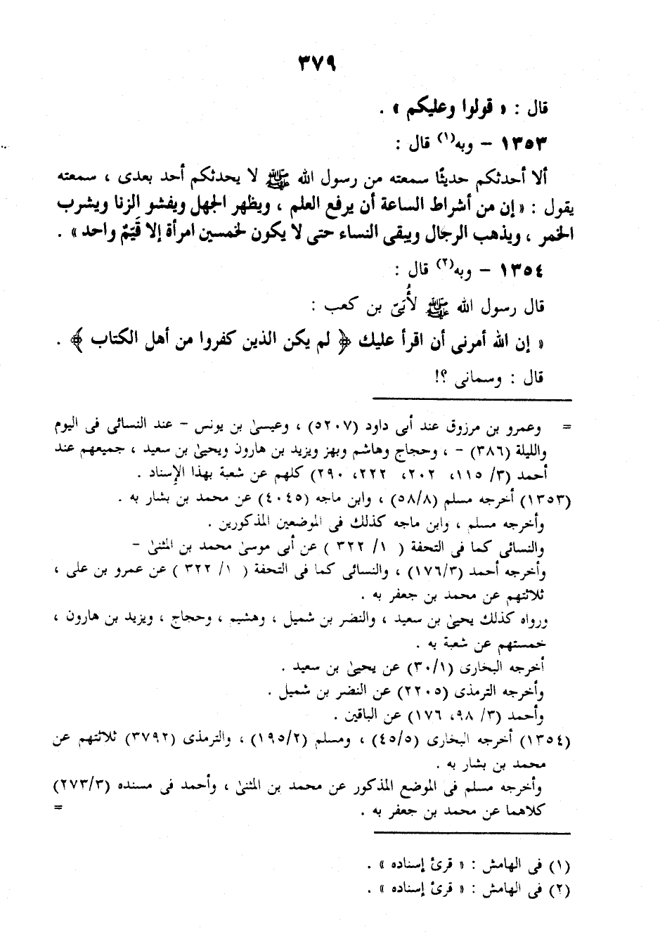 1353 - وَبِهِ قَالَ أَلَا أُحَدِّثُكُمُ حَدِيثًا سَمِعْتُهُ مِنْ رَسُولِ اللَّهِ صَلَّى اللهُ عَلَيْهِ وَسَلَّمَ لَا يُحَدِّثُكُمْ أَحَدٌ بَعْدِي؛ سَمِعْتُهُ يَقُولُ: «إِنَّ §مِنْ أَشْرَاطِ السَّاعَةِ أَنْ يُرْفَعَ الْعِلْمُ، وَيَظْهَرَ الْجَهْلُ، وَيَفْشُوَ الزِّنَا، وَيُشْرَبَ الْخَمْرُ، وَيَذْهَبَ الرِّجَالُ وَيَبْقَى النِّسَاءُ؛ حَتَّى لَا يَكُونَ لِخَمْسِينَ امْرَأَةً إِلَّا قَيِّمٌ وَاحِدٌ»