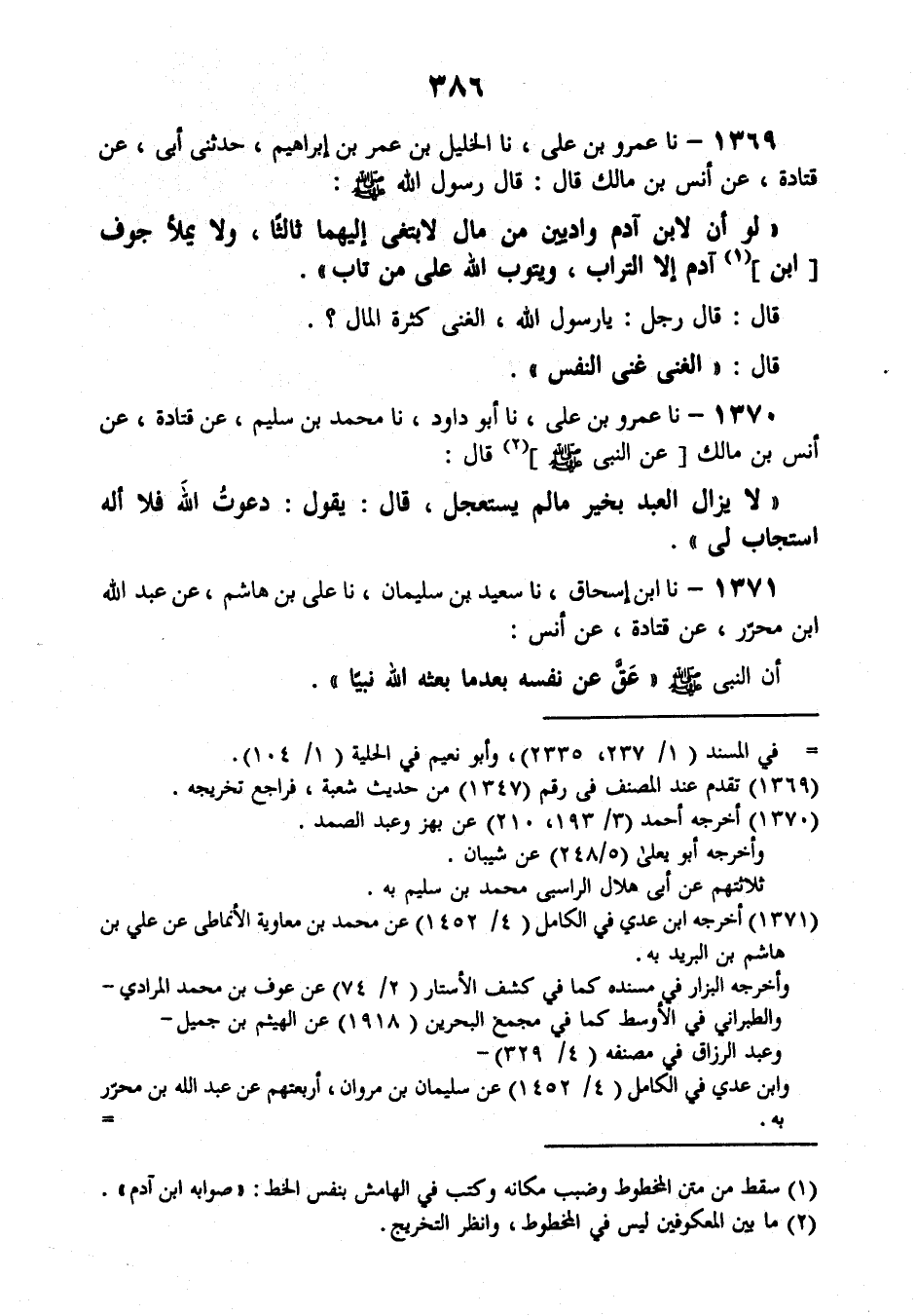 1369 - نَا عَمْرُو بْنُ عَلِيٍّ، نَا الْخَلِيلُ بْنُ عُمَرَ بْنِ إِبْرَاهِيمَ، حَدَّثَنِي أَبَى، عَنْ قَتَادَةَ، عَنْ أَنَسِ بْنِ مَالِكٍ قَالَ: قَالَ رَسُولُ اللَّهِ صَلَّى اللهُ عَلَيْهِ وَسَلَّمَ: «§لَوْ أَنَّ لِابْنِ آدَمَ وَادِيَيْنِ مِنْ مَالٍ لَابْتَغَى إِلَيْهِمَا ثَالِثًا، وَلَا يَمْلَأُ جَوْفَ ابْنِ آدَمَ إِلَّا التُّرَابُ، وَيَتُوبُ اللَّهُ عَلَى مَنْ تَابَ» ، قَالَ: قَالَ رَجُلٌ: يَا رَسُولَ اللَّهِ، الْغِنَى كَثْرَةُ الْمَالِ؟ . قَالَ: «الْغِنَى غِنَى النَّفْسِ»