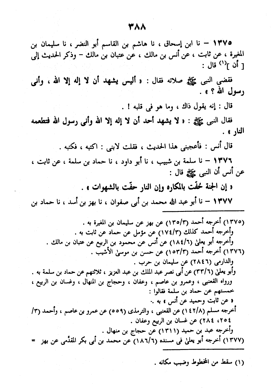 1375 - نَا ابْنُ إِسْحَاقَ , نَا هَاشِمُ بْنُ الْقَاسِمِ أَبُو النَّضْرِ، نَا سُلَيْمَانُ بْنُ الْمُغِيرَةِ، عَنْ ثَابِتٍ، عَنْ أَنَسِ بْنِ مَالِكٍ، عَنْ عِتْبَانَ بْنِ مَالِكٍ، وَذَكَرَ الْحَدِيثَ إِلَى أَنْ قَالَ: فَقَضَى النَّبِيُّ صَلَّى اللهُ عَلَيْهِ وَسَلَّمَ صَلَاتَهُ، فَقَالَ: «§أَلَيْسَ يَشْهَدُ أَنْ لَا إِلَهَ إِلَّا اللَّهُ، وَأَنِّي رَسُولُ اللَّهِ؟» ، قَالَ: إِنَّهُ يَقُولُ ذَاكَ، وَمَا هُوَ فِي قَلْبِهِ، فَقَالَ النَّبِيُّ صَلَّى اللهُ عَلَيْهِ وَسَلَّمَ: «لَا يَشْهَدُ أَحَدٌ أَنْ لَا إِلَهَ إِلَّا اللَّهُ، وَأَنِّي رَسُولُ اللَّهُ، فَتَطْعَمُهُ النَّارُ» ، قَالَ أَنَسٌ: فَأَعْجَبَنِي هَذَا الْحَدِيثُ، فَقُلْتُ لِابْنِي: اكْتُبْهُ، فَكَتَبَهُ