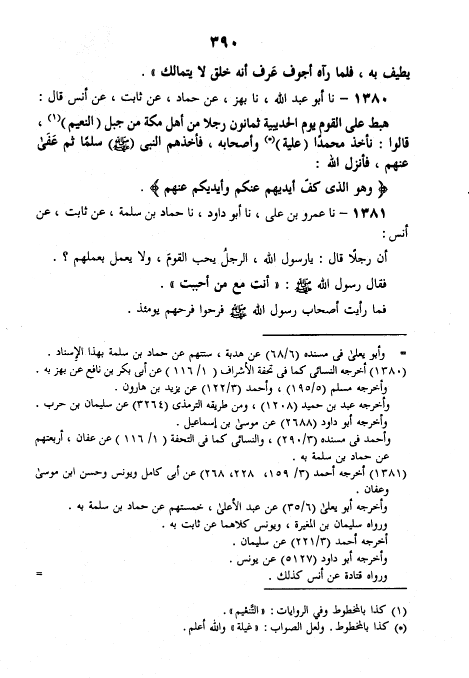 1380 - نَا أَبُو عَبْدِ اللَّهِ , نَا بَهْزٌ، عَنْ حَمَّادٍ، عَنْ ثَابِتٍ، عَنْ أَنَسٍ قَالَ: هَبَطَ عَلَى الْقَوْمِ يَوْمَ الْحُدَيْبِيَةِ ثَمَانُونَ رَجُلًا مِنْ أَهْلِ مَكَّةَ مِنْ جَبَلِ التَّنْعِيمِ، قَالُوا: نَأْخُذُ مُحَمَّدًا غِيلَةً وَأَصْحَابَهُ، §فَأَخَذَهُمُ النَّبِيُّ صَلَّى اللهُ عَلَيْهِ وَسَلَّمَ سِلْمًا، ثُمَّ عَفَا عَنْهُمْ، فَأَنْزَلَ اللَّهُ: {وَهُوَ الَّذِي كَفَّ أَيْدِيهِمْ عَنْكُمْ وَأَيْدِيَكُمْ عَنْهُمْ} [الفتح: 24]