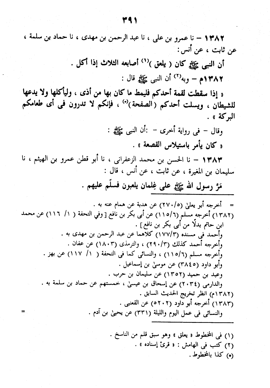1382 - نَا عَمْرُو بْنُ عَلِيٍّ، نَا عَبْدُ الرَّحْمَنِ بْنُ مَهْدِيٍّ , نَا حَمَّادُ بْنُ سَلَمَةَ، عَنْ ثَابِتٍ، عَنْ أَنَسٍ أَنَّ النَّبِيَّ صَلَّى اللهُ عَلَيْهِ وَسَلَّمَ كَانَ §يَلْعَقُ أَصَابِعَهُ الثَّلَاثَ إِذَا أَكَلَ