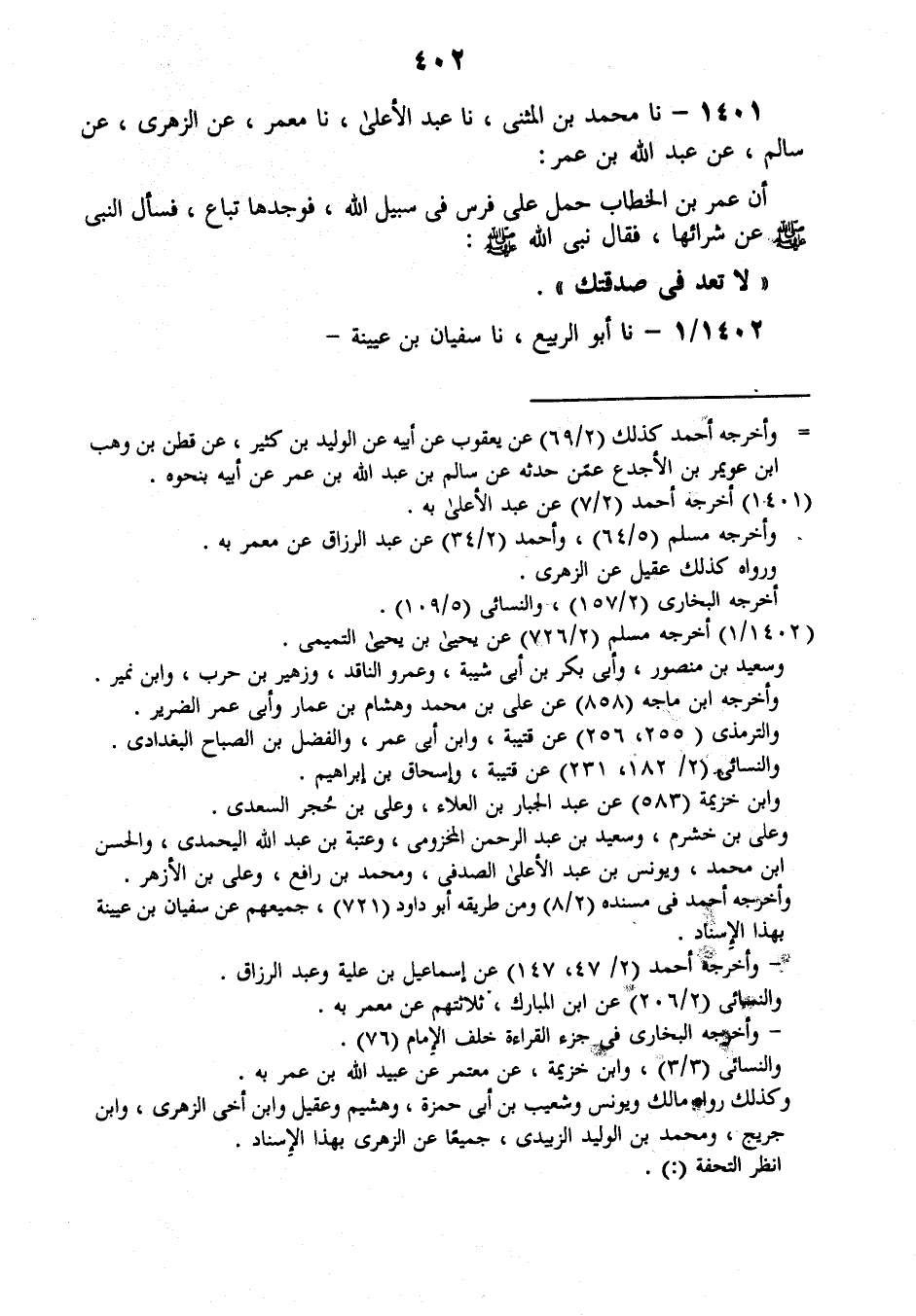1401 - نَا مُحَمَّدُ بْنُ الْمُثَنَّى، نَا عَبْدُ الْأَعْلَى، نَا مَعْمَرٌ، عَنِ الزُّهْرِيِّ، عَنْ سَالِمٍ، عَنْ عَبْدِ اللَّهِ بْنِ عُمَرَ: أَنَّ عُمَرَ بْنَ الْخَطَّابِ حَمَلَ عَلَى فَرَسٍ فِي سَبِيلِ اللَّهِ، فَوَجَدَهَا تُبَاعُ، فَسَأَلَ النَّبِيَّ صَلَّى اللهُ عَلَيْهِ وَسَلَّمَ عَنْ شِرَائِهَا، فَقَالَ نَبِيُّ اللَّهِ صَلَّى اللهُ عَلَيْهِ وَسَلَّمَ: «§لَا تَعُدْ فِي صَدَقَتِكَ»