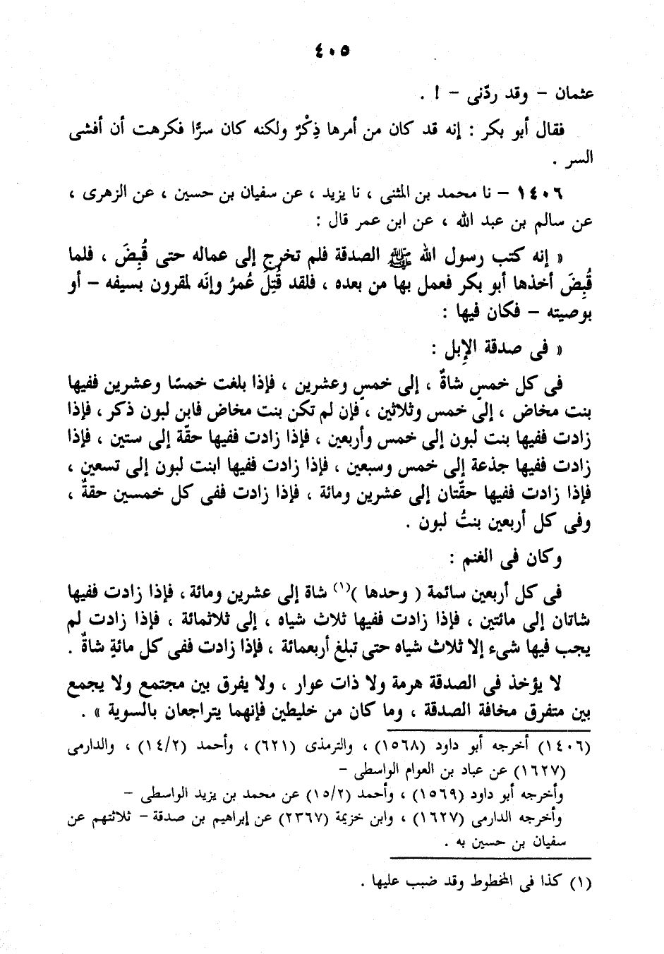 1406 - نَا مُحَمَّدُ بْنُ الْمُثَنَّى، نَا يَزِيدُ، عَنْ سُفْيَانَ بْنِ حُسَيْنٍ، عَنِ الزُّهْرِيِّ , عَنْ سَالِمِ بْنِ عَبْدِ اللَّهِ، عَنِ ابْنِ عُمَرَ قَالَ: إِنَّهُ كَتَبَ رَسُولُ اللَّهِ صَلَّى اللهُ عَلَيْهِ وَسَلَّمَ الصَّدَقَةَ، فَلَمْ تَخْرُجْ إِلَى عُمَّالِهِ حَتَّى قُبِضَ، فَلَمَّا قُبِضَ أَخَذَهَا أَبُو بَكْرٍ فَعَمِلَ بِهَا مِنْ بَعْدِهِ، فَلَقَدْ قُتِلَ عُمَرُ وَإِنَّهُ لَمَقْرُونٌ بِسَيْفِهِ أَوْ بِوَصِيَّتِهِ فَكَانَ فِيهَا: «فِي §صَدَقَةِ الْإِبِلِ فِي كُلِّ خَمْسٍ شَاةٌ إِلَى خَمْسٍ وَعِشْرِينَ، فَإِذَا بَلَغَتْ خَمْسًا وَعِشْرِينَ فَفِيهَا بِنْتُ مَخَاضٍ إِلَى خَمْسٍ وَثَلَاثِينَ، فَإِنْ لَمْ تَكُنْ بِنْتُ مَخَاضٍ فَابْنُ لَبُونٍ ذَكَرٌ، فَإِذَا زَادَتْ فَفِيهَا بِنْتُ لَبُونٍ إِلَى خَمْسٍ وَأَرْبَعِينَ، فَإِذَا زَادَتْ فَفِيهَا حِقَّةٌ إِلَى سِتِّينَ، فَإِذَا زَادَتْ فَفِيهَا جَذَعَةٌ إِلَى خَمْسٍ وَسَبْعِينَ، فَإِذَا زَادَتْ فَفِيهَا ابْنَةُ لَبُونٍ إِلَى تِسْعِينَ، فَإِذَا زَادَتْ فَفِيهَا حِقَّتَانِ إِلَى عِشْرِينَ وَمِائَةٍ، فَإِذَا زَادَتْ فَفِي كُلِّ خَمْسِينَ حِقَّةٌ، وَفِي كُلِّ أَرْبَعِينَ بِنْتُ لَبُونٍ، وَكَانَ فِي الْغَنَمِ فِي كُلِّ أَرْبَعِينَ سَائِمَةٌ، وَحَدُّهَا شَاةٌ إِلَى عِشْرِينَ وَمِائَةٍ، فَإِذَا زَادَتْ فَفِيهَا شَاتَانِ إِلَى مِائَتَيْنِ، فَإِذَا زَادَتْ فَفِيهَا ثَلَاثُ شِيَاهٍ إِلَى ثَلَاثِمِائَةٍ، فَإِذَا زَادَتْ لَمْ يَجِبْ فِيهَا شَيْءٌ إِلَّا ثَلَاثُ شِيَاهٍ حَتَّى تَبْلُغَ أَرْبَعَمِائَةٍ، فَإِذَا زَادَتْ فَفِي كُلِّ مِائَةٍ شَاةٌ، لَا يُؤْخَذُ فِي الصَّدَقَةِ هَرِمَةٌ وَلَا ذَاتُ عَوَارٍ، وَلَا يُفَرَّقُ بَيْنَ مُجْتَمِعٍ، وَلَا يُجْمَعُ بَيْنَ مُتَفَرِّقٍ مَخَافَةَ الصَّدَقَةِ، وَمَا كَانَ مِنْ خَلِيطَيْنِ فَإِنَّهُمَا يَتَرَاجَعَانِ بِالسَّوِيَّةِ»
