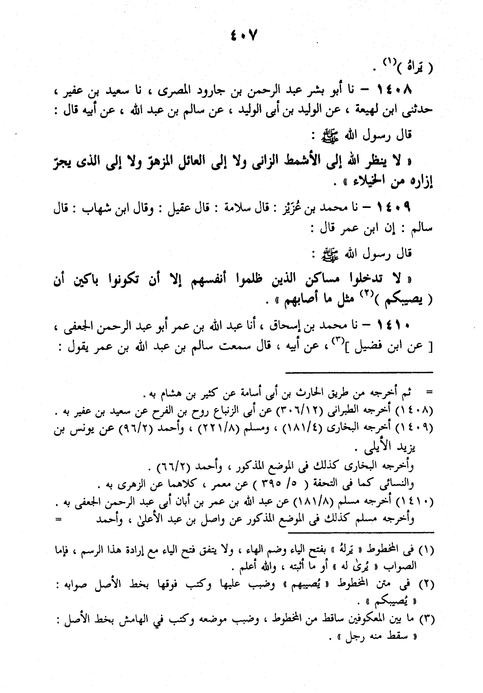 1409 - نَا مُحَمَّدُ بْنُ عَزِيزٍ، قَالَ سَلَامَةُ: قَالَ عُقَيْلٌ: وَقَالَ ابْنُ شِهَابٍ: قَالَ سَالِمٌ: إِنَّ ابْنَ عُمَرَ قَالَ: قَالَ رَسُولُ اللَّهِ صَلَّى اللهُ عَلَيْهِ وَسَلَّمَ: «§لَا تَدْخُلُوا مَسَاكِنَ الَّذِينَ ظَلَمُوا أَنْفُسَهُمْ إِلَّا أَنْ تَكُونُوا بَاكِينَ؛ أَنْ يُصِيبَكُمْ مِثْلُ مَا أَصَابَهُمْ»