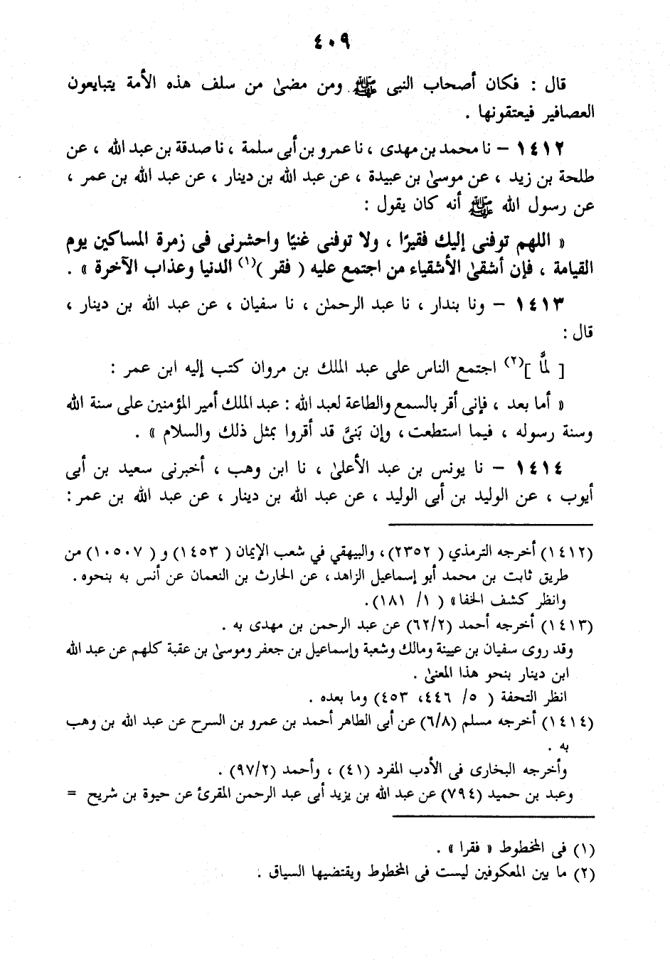 1412 - نَا مُحَمَّدُ بْنُ مَهْدِيٍّ، نَا عَمْرُو بْنُ أَبِي سَلَمَةَ، نَا صَدَقَةُ بْنُ عَبْدِ اللَّهِ، عَنْ طَلْحَةَ بْنِ زَيْدٍ، عَنْ مُوسَى بْنِ عُبَيْدَةَ، عَنْ عَبْدِ اللَّهِ بْنِ دِينَارٍ , عَنْ عَبْدِ اللَّهِ بْنِ عُمَرَ , عَنْ رَسُولِ اللَّهِ صَلَّى اللهُ عَلَيْهِ وَسَلَّمَ، أَنَّهُ كَانَ يَقُولُ: «§اللَّهُمَّ تَوَفَّنِي إِلَيْكَ فَقِيرًا، وَلَا تَوَفَّنِي غَنِيًّا، وَاحْشُرْنِي فِي زُمْرَةِ الْمَسَاكِينِ يَوْمَ الْقِيَامَةِ، فَإِنَّ أَشْقَى الْأَشْقِيَاءِ مَنِ اجْتَمَعَ عَلَيْهِ فَقْرُ الدُّنْيَا، وَعَذَابُ الْآخِرَةِ»