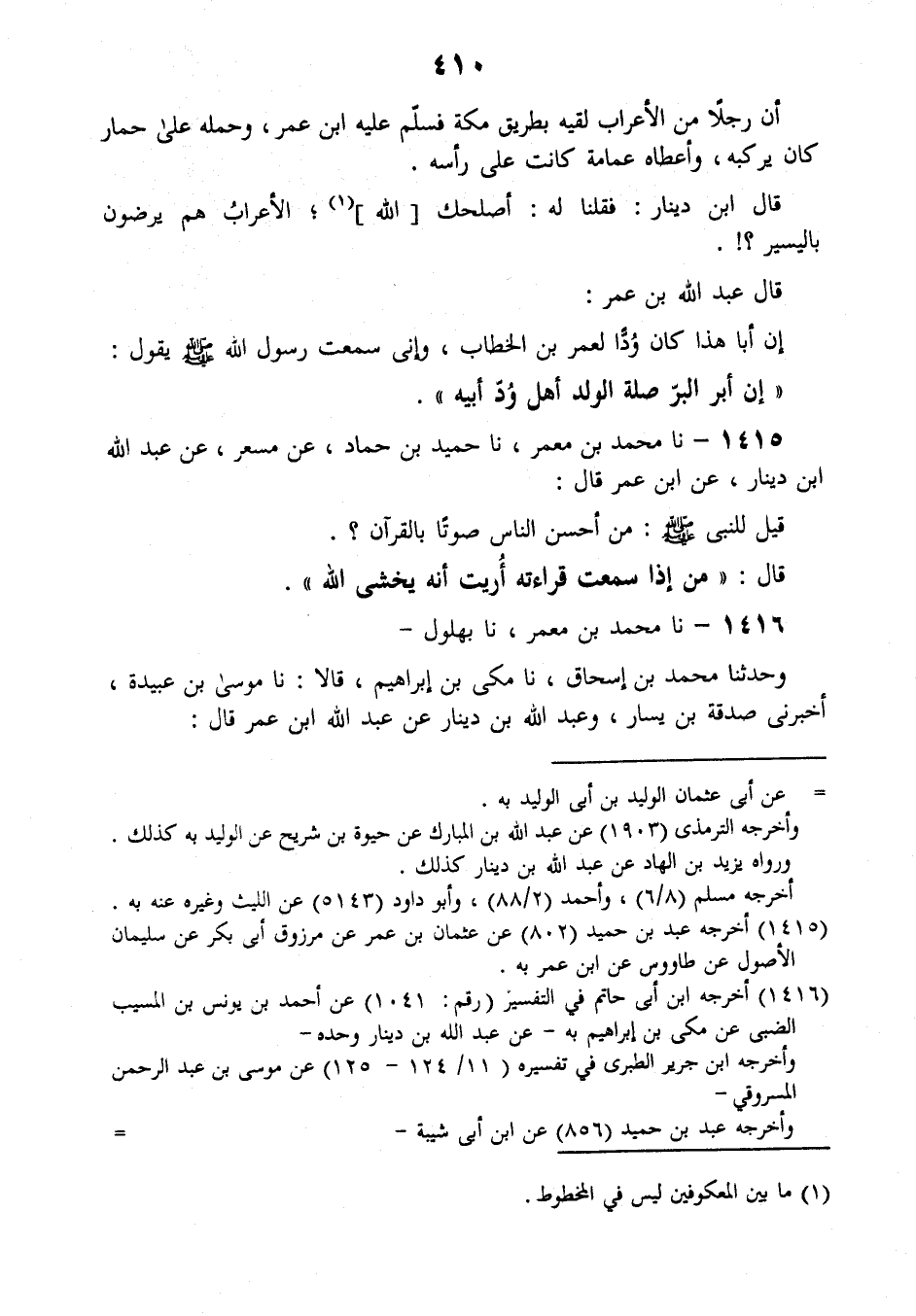 1415 - نَا مُحَمَّدُ بْنُ مَعْمَرٍ، نَا حُمَيْدُ بْنُ حَمَّادٍ، عَنْ مِسْعَرٍ، عَنْ عَبْدِ اللَّهِ بْنِ دِينَارٍ , عَنِ ابْنِ عُمَرَ قَالَ: قِيلَ لِلنَّبِيِّ صَلَّى اللهُ عَلَيْهِ وَسَلَّمَ: مَنْ أَحْسَنُ النَّاسِ صَوْتًا بِالْقُرْآنِ؟، قَالَ: «مَنْ §إِذَا سَمِعْتَ قِرَاءَتَهُ أُرِيتَ أَنَّهُ يَخْشَى اللَّهَ»