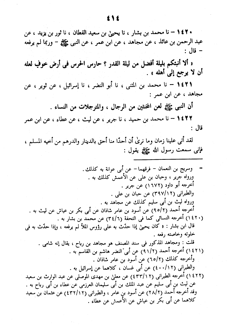 1420 - نَا مُحَمَّدُ بْنُ بَشَّارٍ، نَا يَحْيَى بْنُ سَعِيدٍ الْقَطَّانُ، نَا ثَوْرُ بْنُ يَزِيدَ، عَنْ عَبْدِ الرَّحْمَنِ بْنِ عَائِذٍ , عَنْ مُجَاهِدٍ، عَنِ ابْنِ عُمَرَ , عَنِ النَّبِيِّ صَلَّى اللهُ عَلَيْهِ وَسَلَّمَ وَرُبَّمَا لَمْ يَرْفَعْهُ قَالَ: «أَلَا §أُنَبِّئُكُمْ بِلَيْلَةٍ أَفْضَلَ مِنْ لَيْلَةِ الْقَدْرِ، حَارِسُ الْحَرَسِ فِي أَرْضِ خَوْفٍ، لَعَلَّهُ أَنْ لَا يَرْجِعَ إِلَى أَهْلِهِ»