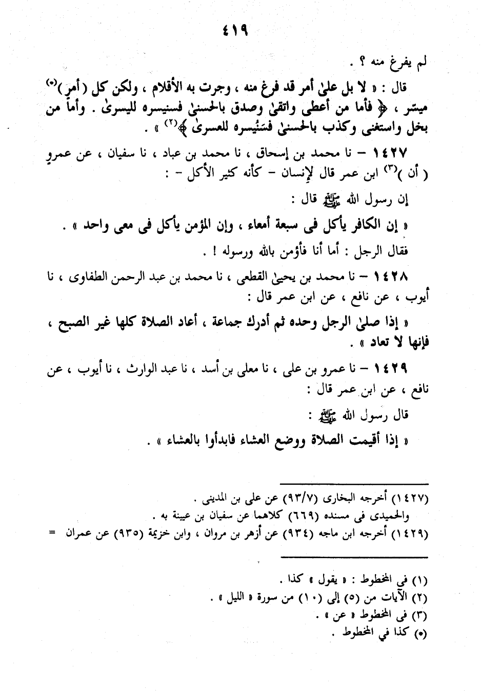 1427 - نَا مُحَمَّدُ بْنُ إِسْحَاقَ، نَا مُحَمَّدُ بْنُ عَبَّادٍ، نَا سُفْيَانُ، عَنْ عَمْرٍو، أَنَّ ابْنَ عُمَرَ قَالَ لِإِنْسَانٍ كَأَنَّهُ كَثِيرُ الْأَكْلِ: إِنَّ رَسُولَ اللَّهِ صَلَّى اللهُ عَلَيْهِ وَسَلَّمَ قَالَ: «إِنَّ §الْكَافِرَ يَأْكُلُ فِي سَبْعَةِ أَمْعَاءٍ، وَإِنَّ الْمُؤْمِنَ يَأْكُلُ فِي مِعًى وَاحِدٍ» ، فَقَالَ الرَّجُلُ: أَمَّا أَنَا فَأُؤْمِنُ بِاللَّهِ وَرَسُولِهِ