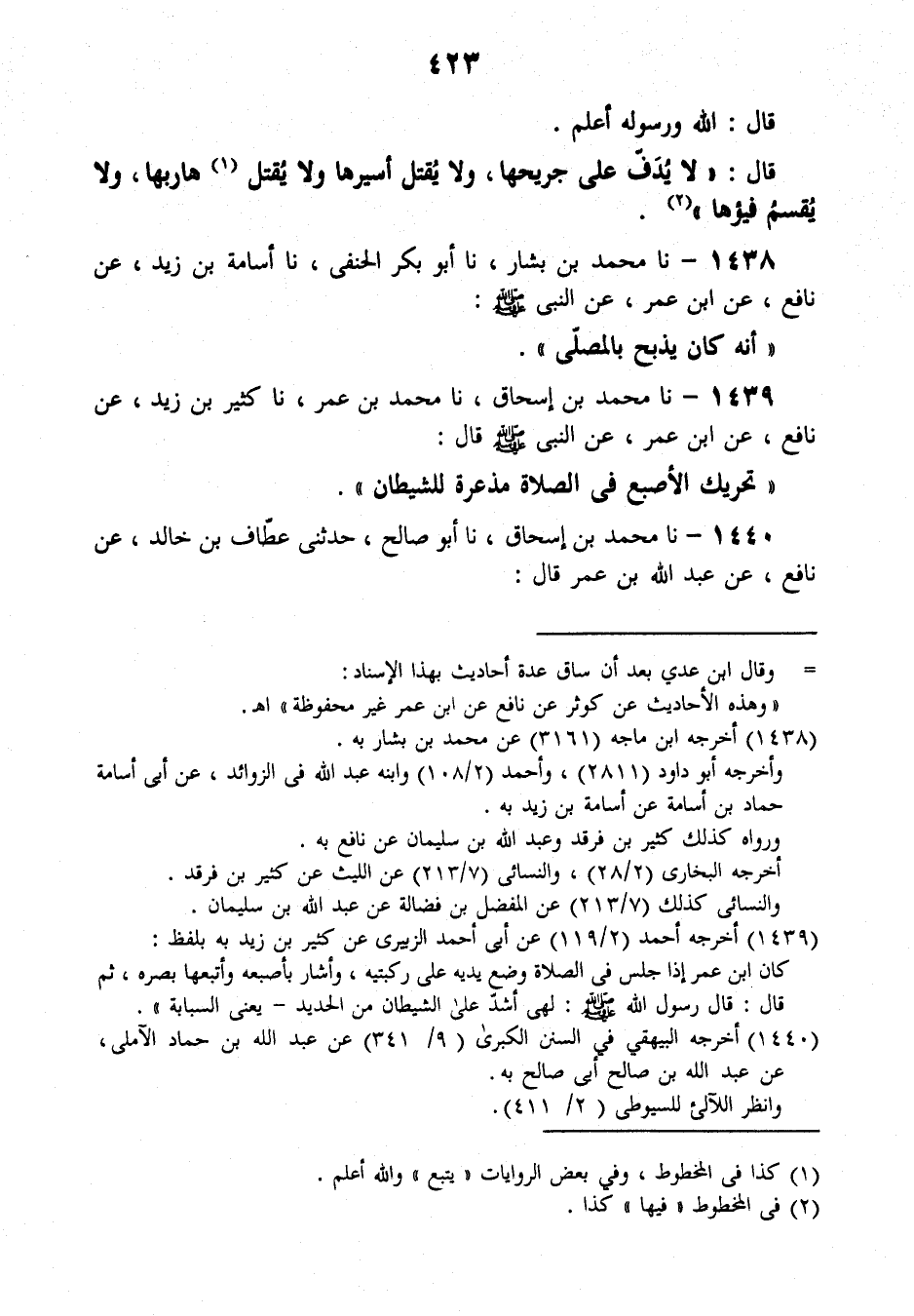 1438 - نَا مُحَمَّدُ بْنُ بَشَّارٍ نَا أَبُو بَكْرٍ الْحَنَفِيُّ , نَا أُسَامَةُ بْنُ زَيْدٍ، عَنْ نَافِعٍ، عَنِ ابْنِ عُمَرَ , عَنِ النَّبِيِّ صَلَّى اللهُ عَلَيْهِ وَسَلَّمَ «أَنَّهُ كَانَ §يَذْبَحُ بِالْمُصَلَّى»