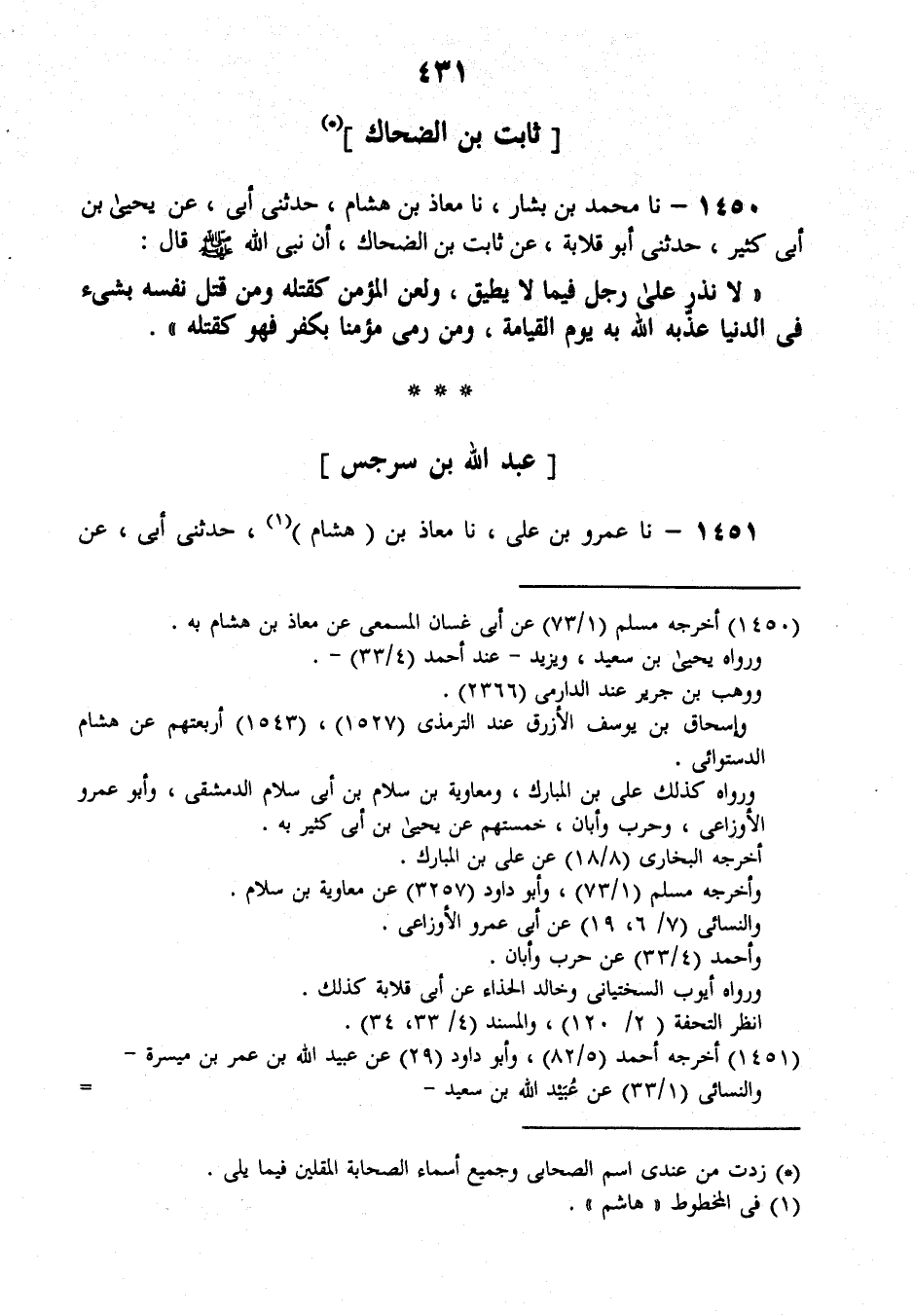 1450 - نَا مُحَمَّدُ بْنُ بَشَّارٍ، نَا مُعَاذُ بْنُ هِشَامٍ، حَدَّثَنِي أَبِي عَنْ يَحْيَى بْنِ أَبِي كَثِيرٍ، حَدَّثَنِي أَبُو قِلَابَةَ , عَنْ ثَابِتِ بْنِ الضَّحَّاكِ، أَنَّ نَبِيَّ اللَّهِ صَلَّى اللهُ عَلَيْهِ وَسَلَّمَ قَالَ: «§لَا نَذْرَ عَلَى رَجُلٍ فِيمَا لَا يُطِيقُ، وَلَعْنُ الْمُؤْمِنِ كَقَتْلِهِ، وَمَنْ قَتَلَ نَفْسَهُ بِشَيْءٍ فِي الدُّنْيَا عَذَّبَهُ اللَّهُ بِهِ يَوْمَ الْقِيَامَةِ، وَمَنْ رَمَى مُؤْمِنًا بِكُفْرٍ فَهُوَ كَقَتْلِهِ»