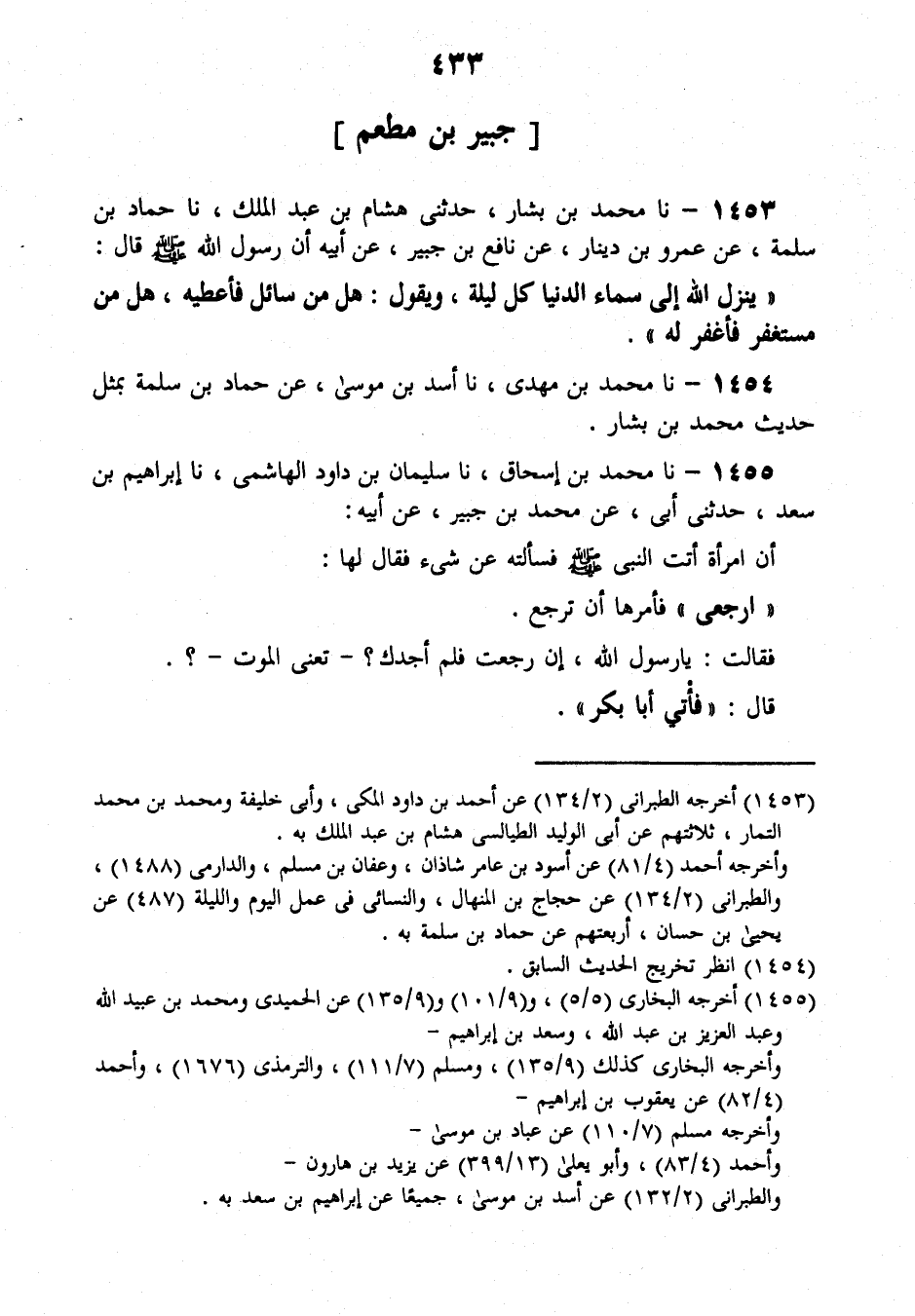 1453 - نَا مُحَمَّدُ بْنُ بَشَّارٍ، حَدَّثَنِي هِشَامُ بْنُ عَبْدِ الْمَلِكِ، نَا حَمَّادُ بْنُ سَلَمَةَ، عَنْ عَمْرِو بْنِ دِينَارٍ، عَنْ نَافِعِ بْنِ جُبَيْرٍ، عَنْ أَبِيهِ أَنَّ رَسُولَ اللَّهِ صَلَّى اللهُ عَلَيْهِ وَسَلَّمَ قَالَ: " §يَنْزِلُ اللَّهُ إِلَى سَمَاءِ الدُّنْيَا كُلَّ لَيْلَةٍ، وَيَقُولُ: هَلْ مِنْ سَائِلٍ فَأُعْطِيَهُ؟ هَلْ مِنْ مُسْتَغْفِرٍ فَأَغْفِرَ لَهُ؟ "