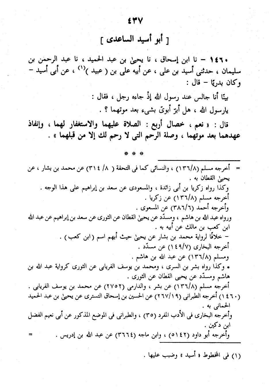 1460 - نَا ابْنُ إِسْحَاقَ , نَا يَحْيَى بْنُ عَبْدِ الْحَمِيدِ، نَا عَبْدُ الرَّحْمَنِ بْنُ سُلَيْمَانَ , حَدَّثَنِي أُسَيْدُ بْنُ عَلِيٍّ، عَنْ أَبِيهِ عَلِيِّ بْنِ عُبَيْدٍ، عَنْ أَبِي أُسَيْدٍ وَكَانَ بَدْرِيًّا قَالَ: بَيْنَا أَنَا جَالِسٌ عِنْدَ رَسُولِ اللَّهِ إِذْ جَاءَهُ رَجُلٌ، فَقَالَ: يَا رَسُولَ اللَّهِ، هَلْ أَبَرُّ أَبَوَيَّ بِشَيْءٍ بَعْدَ مَوْتِهِمَا؟، قَالَ: " نَعَمْ، خِصَالٌ أَرْبَعٌ: §الصَّلَاةُ عَلَيْهِمَا، وَالِاسْتِغْفَارُ لَهُمَا، وَإِنْفَاذُ عَهْدِهِمَا بَعْدَ مَوْتِهِمَا، وَصِلَةُ الرَّحِمِ الَّتِي لَا رَحِمَ لَكَ إِلَّا مِنْ قِبَلِهِمَا "