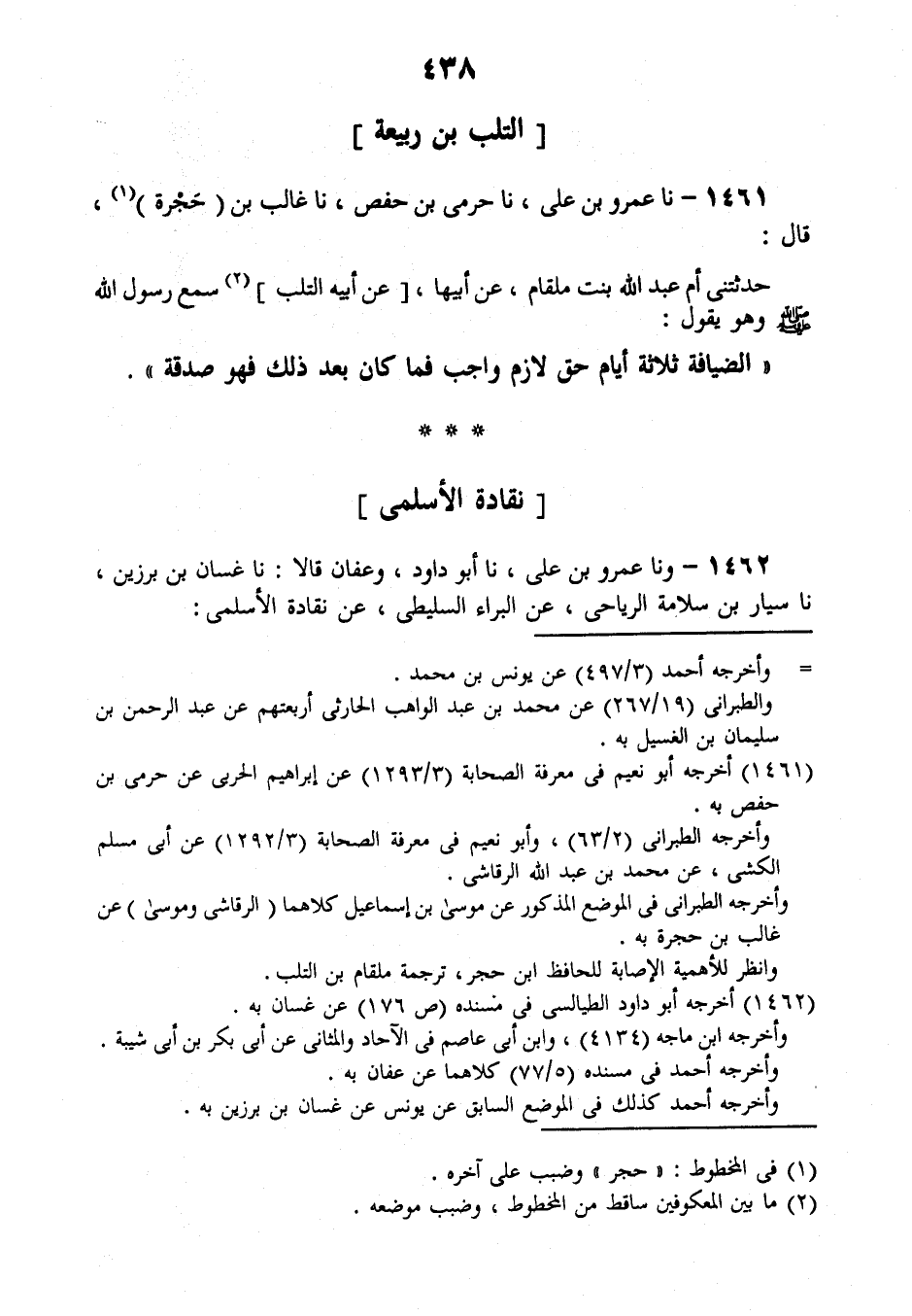 1461 - نَا عَمْرُو بْنُ عَلِيٍّ، نَا حِرْمِيُّ بْنُ حَفْصٍ، نَا غَالِبُ بْنُ حُجْرَةَ، قَالَ: حَدَّثَتْنِي أُمُّ عَبْدِ اللَّهِ بِنْتُ مِلْقَامٍ، عَنْ أَبِيهَا عَنْ أَبِيهِ التَّلِبِّ، سَمِعَ رَسُولَ اللَّهِ صَلَّى اللهُ عَلَيْهِ وَسَلَّمَ وَهُوَ يَقُولُ: «§الضِّيَافَةُ ثَلَاثَةَ أَيَّامٍ حَقٌّ لَازِمٌ وَاجِبٌ، فَمَا كَانَ بَعْدَ ذَلِكَ فَهُوَ صَدَقَةٌ»