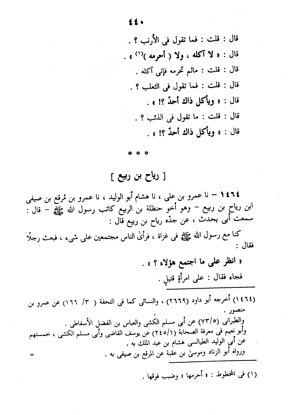 1464 - نَا عَمْرُو بْنُ عَلِيٍّ، نَا هِشَامٌ أَبُو الْوَلِيدِ، نَا عَمْرُو بْنُ مُرَقَّعِ بْنِ صَيْفِيِّ بْنِ رِيَاحِ بْنِ رَبِيعٍ وَهُوَ أَخُو حَنْظَلَةَ بْنِ الرَّبِيعِ كَاتَبِ رَسُولِ اللَّهِ صَلَّى اللهُ عَلَيْهِ وَسَلَّمَ قَالَ: سَمِعْتُ أَبِي يُحَدِّثُ عَنْ جَدِّهِ رِيَاحِ بْنِ رَبِيعٍ قَالَ: كُنَّا مَعَ رَسُولِ اللَّهِ صَلَّى اللهُ عَلَيْهِ وَسَلَّمَ فِي غَزَاةٍ، فَرَأَى النَّاسَ مُجْتَمِعِينَ عَلَى شَيْءٍ، فَبَعَثَ رَجُلًا فَقَالَ: «انْظُرْ عَلَامَ اجْتَمَعَ هَؤُلَاءِ؟» ، فَجَاءَ فَقَالَ: عَلَى امْرَأَةٍ قَتِيلٍ -[441]-، فَقَالَ: «مَا كَانَتِ هَذِهِ لِتُقَاتِلَ» ، قَالَ: وَخَالِدُ بْنُ الْوَلِيدِ عَلَى الْمُقَدِّمَةِ، قَالَ: فَبَعَثَ رَجُلًا فَقَالَ: " قُلْ لِخَالِدٍ: §لَا تَقْتُلَنَّ ذُرِّيَّةً، وَلَا عَسِيفًا "