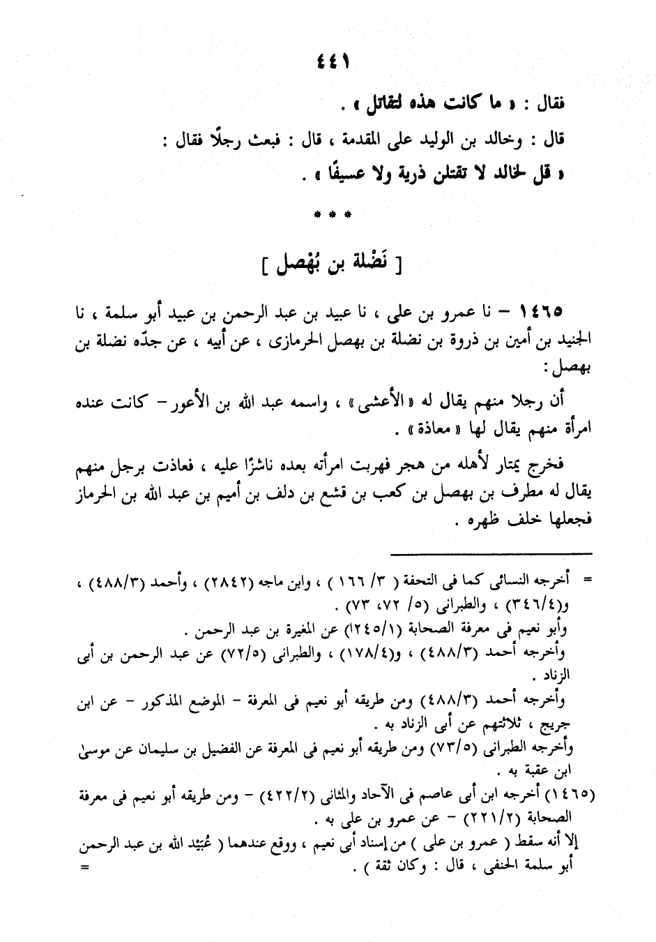 1465 - نَا عَمْرُو بْنُ عَلِيٍّ، نَا عُبَيْدُ بْنُ عَبْدِ الرَّحْمَنِ بْنِ عُبَيْدٍ أَبُو سَلَمَةَ، نَا الْجُنَيْدُ بْنُ أَمِينِ بْنِ ذِرْوَةَ بْنِ نَضْلَةَ بْنِ بُهْصُلٍ الْحِرْمَازِيُّ، عَنْ أَبِيهِ عَنْ جَدِّهِ نَضْلَةَ بْنِ بُهْصُلٍ أَنَّ رَجُلًا مِنْهُمْ يُقَالُ لَهُ: الْأَعْشَى، وَاسْمُهُ عَبْدُ اللَّهِ بْنُ الْأَعْوَرِ كَانَتْ عِنْدَهُ امْرَأَةٌ مِنْهُمْ يُقَالُ لَهَا: مُعَاذَةُ فَخَرَجَ يَمْتَارُ لِأَهْلِهِ مِنْ هَجَرَ، فَهَرَبْتِ امْرَأَتُهُ بَعْدَهُ نَاشِزًا عَلَيْهِ، فَعَاذَتْ بِرَجُلٍ مِنْهُمْ يُقَالُ لَهُ: مُطَرِّفُ بْنُ بُهْصُلِ بْنِ كَعْبِ بْنِ قَشْعِ بْنِ دُلَفِ بْنِ أُمَيْمِ بْنِ عَبْدِ اللَّهِ بْنِ الْحِرْمَازِ فَجَعَلَهَا خَلْفَ ظَهْرِهِ -[442]-، فَلَمَّا قَدِمَ لَمْ يَجِدْهَا فِي بَيْتِهِ فَأُخْبِرَ أَنَّهَا نَشَزَتْ عَلَيْهِ، وَأَنَّهَا عَاذَتْ بِمُطَرِّفِ بْنِ بُهْصُلٍ فَأَتَاهُ فَقَالَ: يَا ابْنَ عَمِّ، عِنْدَكَ امْرَأَتِي فَادْفَعْهَا إِلَيَّ، قَالَ: لَيْسَتْ عِنْدِي، وَلَوْ كَانَتْ عِنْدِي لَمْ أَدْفَعْهَا إِلَيْكَ، قَالَ: وَكَانَ مُطَرِّفٌ أَعَزَّ مِنْهُ، فَخَرَجَ حَتَّى أَتَى رَسُولَ اللَّهِ صَلَّى اللهُ عَلَيْهِ وَسَلَّمَ فَعَاذَ بِهِ، فَأَنْشَأَ يَقُولُ: