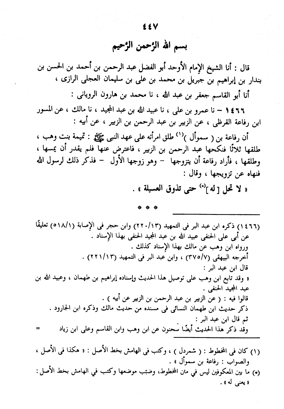 1466 - نَا عَمْرُو بْنُ عَلِيٍّ، نَا عُبَيْدُ اللَّهِ بْنُ عَبْدِ الْمَجِيدِ، نَا مَالِكٌ، عَنِ الْمِسْوَرِ بْنِ رِفَاعَةَ الْقُرَظِيِّ , عَنِ الزُّبَيْرِ بْنِ عَبْدِ الرَّحْمَنِ بْنِ الزُّبَيْرِ , عَنْ أَبِيهِ أَنَّ رِفَاعَةَ بْنَ سَمَوْأَلٍ طَلَّقَ امْرَأَتَهُ عَلَى عَهْدِ النَّبِيِّ صَلَّى اللهُ عَلَيْهِ وَسَلَّمَ تَمِيمَةَ بِنْتَ وَهْبٍ طَلَّقَهَا ثَلَاثًا، فَنَكَحَهَا عَبْدُ الرَّحْمَنِ بْنُ الزُّبَيْرِ فَاعْتَرَضَ عَنْهَا فَلَمْ يَقْدِرْ أَنْ يَمَسَّهَا وَطَلَّقَهَا، فَأَرَادَ رِفَاعَةُ أَنْ يَتَزَوَّجُهَا وَهُوَ زَوْجُهَا الْأَوَّلُ، فَذَكَرَ ذَلِكَ لِرَسُولِ اللَّهِ فَنَهَاهُ عَنْ تَزْوِيجِهَا وَقَالَ: «§لَا تَحِلُّ لَهُ حَتَّى تَذُوقَ الْعُسَيْلَةَ»