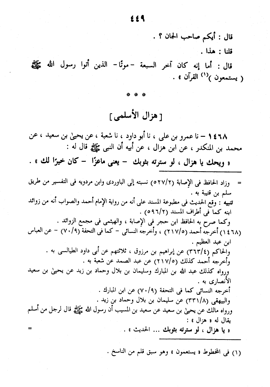 1468 - نَا عَمْرُو بْنُ عَلِيٍّ، نَا أَبُو دَاوُدَ , نَا شُعْبَةُ، عَنْ يَحْيَى بْنِ سَعِيدٍ، عَنْ مُحَمَّدِ بْنِ الْمُنْكَدِرِ، عَنِ ابْنِ هَزَّالٍ، عَنْ أَبِيهِ أَنَّ النَّبِيَّ صَلَّى اللهُ عَلَيْهِ وَسَلَّمَ قَالَ لَهُ: «وَيْحَكَ يَا هَزَّالُ، §لَوْ سَتَرْتَهُ بِثَوْبِكَ يَعْنِي مَاعِزًا كَانَ خَيْرًا لَكَ»