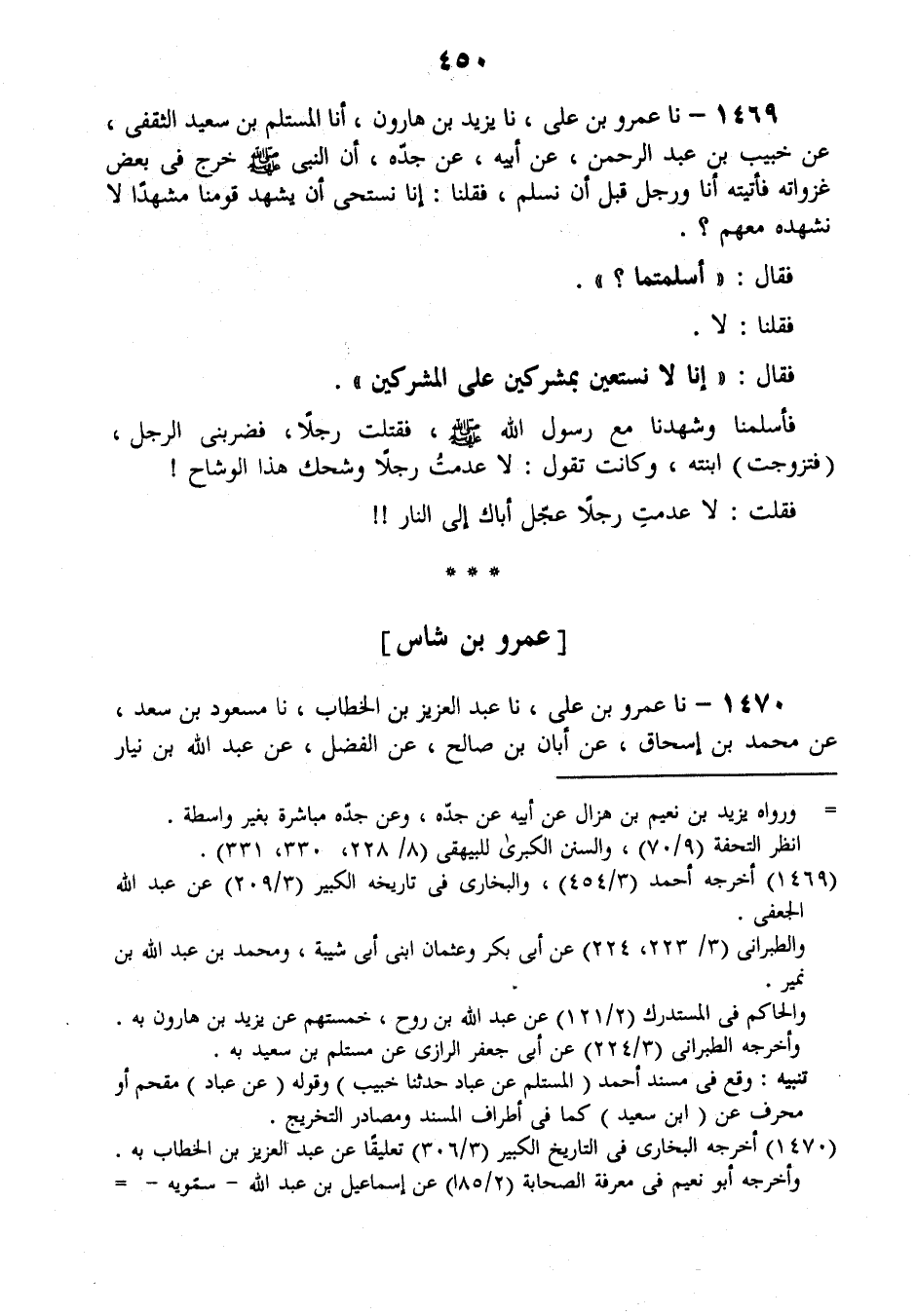 1469 - نَا عَمْرُو بْنُ عَلِيٍّ، نَا يَزِيدُ بْنُ هَارُونَ، أنا الْمُسْتَلِمُ بْنُ سَعِيدٍ الثَّقَفِيُّ، عَنْ خُبَيْبِ بْنِ عَبْدِ الرَّحْمَنِ، عَنْ أَبِيهِ عَنْ جَدِّهِ أَنَّ النَّبِيَّ صَلَّى اللهُ عَلَيْهِ وَسَلَّمَ خَرَجَ فِي بَعْضِ غَزَوَاتِهِ؛ فَأَتَيْتُهُ أَنَا وَرَجُلٌ قَبْلَ أَنْ نُسْلِمَ فَقُلْنَا: إِنَّا نَسْتَحِي أَنْ يَشْهَدَ قَوْمُنَا مَشْهَدًا لَا نَشْهَدُهُ مَعَهُمْ، فَقَالَ: «أَسْلَمْتُمَا؟» ، فَقُلْنَا: لَا، فَقَالَ: «إِنَّا §لَا نَسْتَعِينُ بِمُشْرِكِينَ عَلَى الْمُشْرِكِينَ» ، فَأَسْلَمْنَا، وَشَهِدْنَا مَعَ رَسُولِ اللَّهِ صَلَّى اللهُ عَلَيْهِ وَسَلَّمَ، فَقَتَلْتُ رَجُلًا، فَضَرَبَنِي الرَّجُلُ، فَتَزَوَّجْتُ ابْنَتَهُ، وَكَانَتْ تَقُولُ: لَا عَدِمْتَ رَجُلًا وَشَّحَكَ هَذَا الْوِشَاحَ، فَقُلْتُ: لَا عَدِمْتِ رَجُلًا عَجَّلَ أَبَاكِ إِلَى النَّارِ