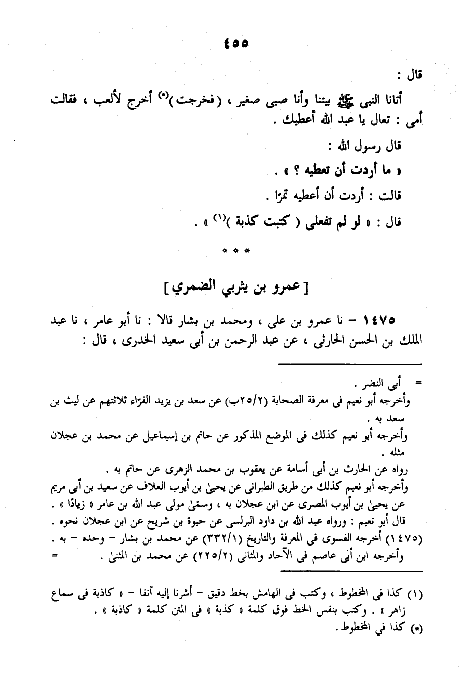 1475 - نَا عَمْرُو بْنُ عَلِيٍّ، وَمُحَمَّدُ بْنُ بَشَّارٍ قَالَا: نَا أَبُو عَامِرٍ , نَا عَبْدُ الْمَلِكِ بْنُ الْحَسَنِ الْحَارِثِيُّ , عَنْ عَبْدِ الرَّحْمَنِ بْنِ أَبِي سَعِيدٍ الْخُدْرِيِّ , قَالَ -[456]-: سَمِعْتُ عُمَارَةَ بْنَ حَارِثَةَ الضَّمْرِيَّ يُحَدِّثُ عَنْ عَمْرِو بْنِ يَثْرِبِيٍّ الضَّمْرِيِّ قَالَ: شَهِدْتُ خُطْبَةَ رَسُولِ اللَّهِ صَلَّى اللهُ عَلَيْهِ وَسَلَّمَ بِمِنًى؛ فَكَانَ فِيمَا خَطَبَ بِهِ: «§وَلَا يَحِلُّ لِأَحَدٍ مِنْ مَالِ أَخِيهِ إِلَّا مَا طَابَتْ بِهِ نَفْسُهُ» ، فَلَمَّا سَمِعْتُهُ قَالَ ذَاكَ قُلْتُ: يَا رَسُولَ اللَّهِ، أَرَأَيْتَ لَوْ لَقِيتُ غَنَمَ ابْنِ عَمِّي، فَأَخَذْتُ مِنْهُ شَاةً فَاجْتَزَزْتُهَا، عَلَيَّ فِي ذَلِكَ شَيْءٌ؟، قَالَ: «إِنْ لَقِيتَهَا نَعْجَةً تَحْمِلُ شَفْرَةً وَأَزْنَادًا بِخَبْتِ الْجَمِيشِ فَلَا تَمَسَّهَا»