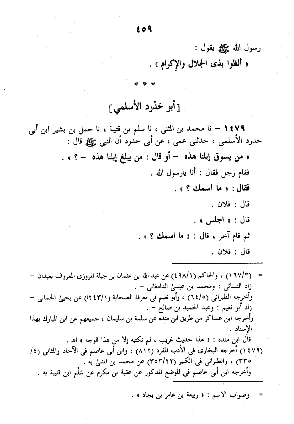 1479 - نَا مُحَمَّدُ بْنُ الْمُثَنَّى، نَا سَلْمُ بْنُ قُتَيْبَةَ، نَا حَمَلُ بْنُ بَشِيرِ بْنِ أَبِي حَدْرَدٍ الْأَسْلَمِيُّ، حَدَّثَنِي عَمِّي، عَنْ أَبِي حَدْرَدٍ أَنَّ النَّبِيَّ صَلَّى اللهُ عَلَيْهِ وَسَلَّمَ قَالَ: " §مَنْ يَسُوقُ إِبِلَنَا هَذِهِ أَوْ قَالَ: مَنْ يُبَلِّغُ إِبِلَنَا هَذِهِ؟ "، فَقَامَ رَجُلٌ فَقَالَ: أَنَا يَا رَسُولَ اللَّهِ. فَقَالَ: «مَا اسْمُكَ؟» ، قَالَ: فُلَانٌ، قَالَ: «اجْلِسْ» ، ثُمَّ قَامَ آخَرُ قَالَ: «مَا اسْمُكَ؟» ، قَالَ: فُلَانٌ -[460]-، قَالَ: «اجْلِسْ» . ثُمَّ قَامَ آخَرُ، قَالَ: «مَا اسْمُكَ؟» ، قَالَ: نَاجِيَةُ الْأَسْلَمِيُّ، قَالَ: «أَنْتَ لَهَا؛ فَسُقْهَا»