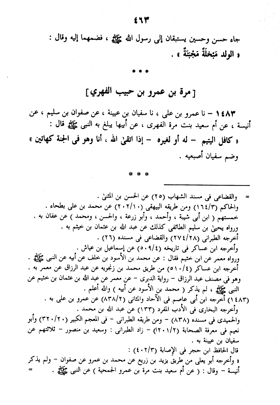 1483 - نَا عَمْرُو بْنُ عَلِيٍّ، نَا سُفْيَانُ بْنُ عُيَيْنَةَ، عَنْ صَفْوَانَ بْنِ سُلَيْمٍ، عَنْ أُنَيْسَةَ عَنْ أُمِّ سَعِيدٍ بِنْتِ مُرَّةَ الْفِهْرِيِّ، عَنْ أَبِيهَا يَبْلُغُ بِهِ النَّبِيَّ صَلَّى اللهُ عَلَيْهِ وَسَلَّمَ قَالَ: «§كَافِلُ الْيَتِيمِ لَهُ أَوْ لِغَيْرِهِ إِذَا اتَّقَى اللَّهَ، أَنَا وَهُوَ فِي الْجَنَّةِ كَهَاتَيْنِ» وَضَمَّ سُفْيَانُ أُصْبُعَيْهِ