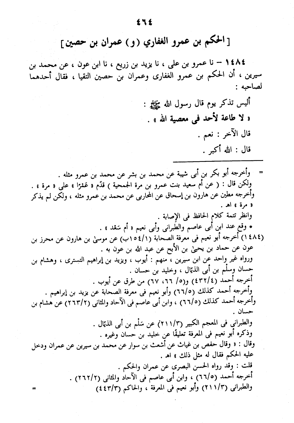 1484 - نَا عَمْرُو بْنُ عَلِيٍّ، نَا يَزِيدُ بْنُ زُرَيْعٍ نَا ابْنُ عَوْنٍ , عَنْ مُحَمَّدِ بْنِ سِيرِينَ، أَنَّ الْحَكَمَ بْنَ عَمْرٍو الْغِفَارِيَّ، وَعِمْرَانَ بْنَ حُصَيْنٍ الْتَقَيَا فَقَالَ أَحَدُهُمَا لِصَاحِبِهِ: أَلَيْسَ تَذْكُرُ يَوْمَ قَالَ رَسُولُ اللَّهِ صَلَّى اللهُ عَلَيْهِ وَسَلَّمَ: «§لَا طَاعَةَ لِأَحَدٍ فِي مَعْصِيَةِ اللَّهِ» ؟ قَالَ الْآخَرُ: نَعَمْ. قَالَ: اللَّهُ أَكْبَرُ