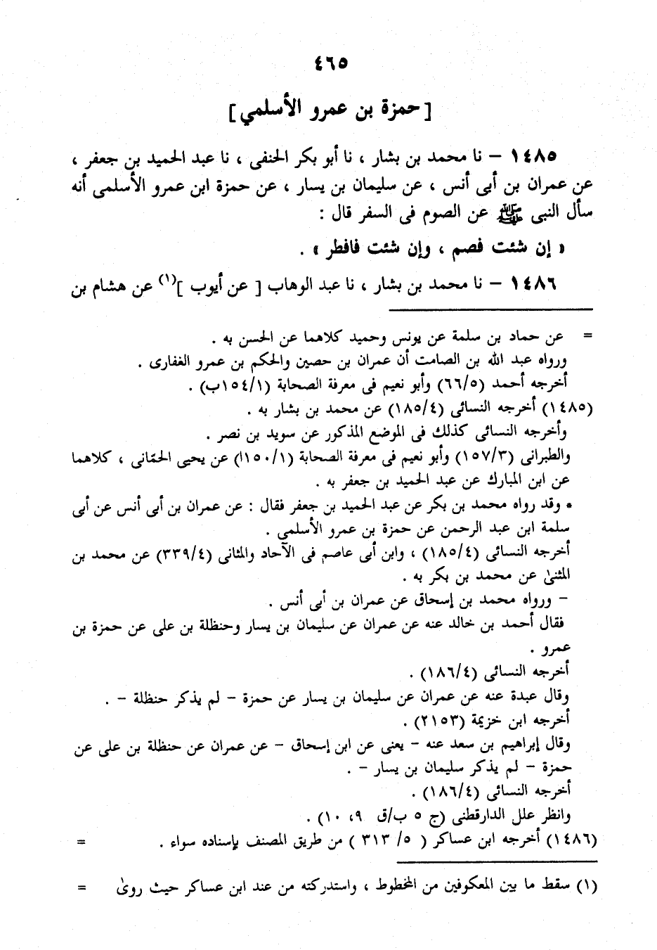 1485 - نَا مُحَمَّدُ بْنُ بَشَّارٍ، نَا أَبُو بَكْرٍ الْحَنَفِيُّ , نَا عَبْدُ الْحَمِيدِ بْنُ جَعْفَرٍ , عَنْ عِمْرَانَ بْنِ أَبِي أَنَسٍ، عَنْ سُلَيْمَانَ بْنِ يَسَارٍ، عَنْ حَمْزَةَ بْنِ عَمْرٍو الْأَسْلَمِيِّ أَنَّهُ سَأَلَ النَّبِيَّ صَلَّى اللهُ عَلَيْهِ وَسَلَّمَ عَنِ الصَّوْمِ فِي السَّفَرِ قَالَ: «§إِنْ شِئْتَ فَصُمْ، وَإِنْ شِئْتَ فَأَفْطِرْ»