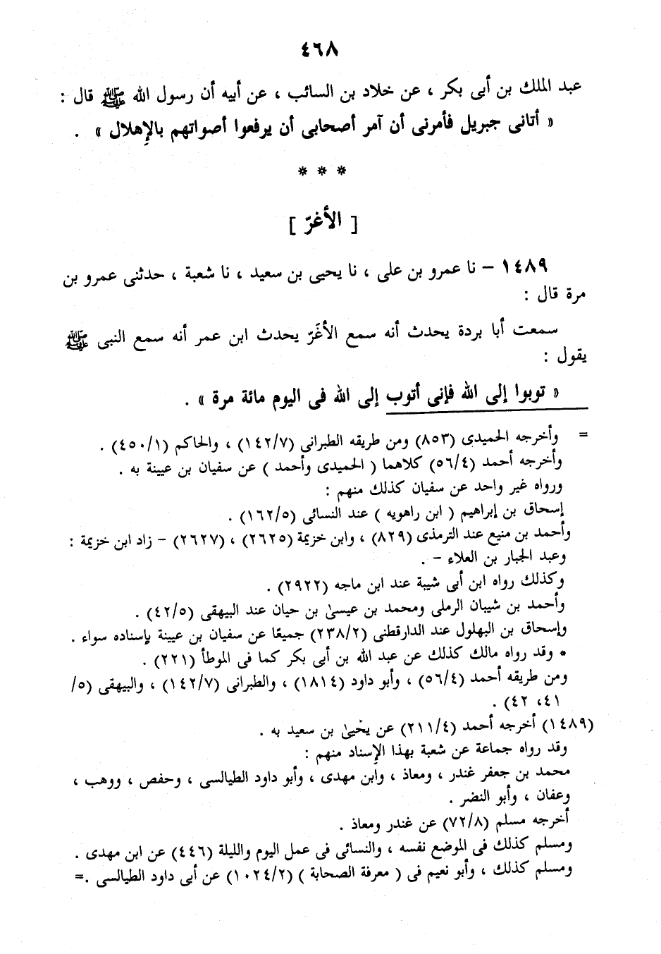 1489 - نَا عَمْرُو بْنُ عَلِيٍّ، نَا يَحْيَى بْنُ سَعِيدٍ، نَا شُعْبَةُ، حَدَّثَنِي عَمْرُو بْنُ مَرَّةَ قَالَ: سَمِعْتُ أَبَا بُرْدَةَ، يُحَدِّثُ، أَنَّهُ سَمِعَ الْأَغَرَّ , يُحَدِّثُ ابْنَ عُمَرَ أَنَّهُ سَمِعَ النَّبِيَّ صَلَّى اللهُ عَلَيْهِ وَسَلَّمَ يَقُولُ: «§تُوبُوا إِلَى اللَّهِ؛ فَإِنِّي أَتُوبُ إِلَى اللَّهِ فِي الْيَوْمِ مِائَةَ مَرَّةٍ»