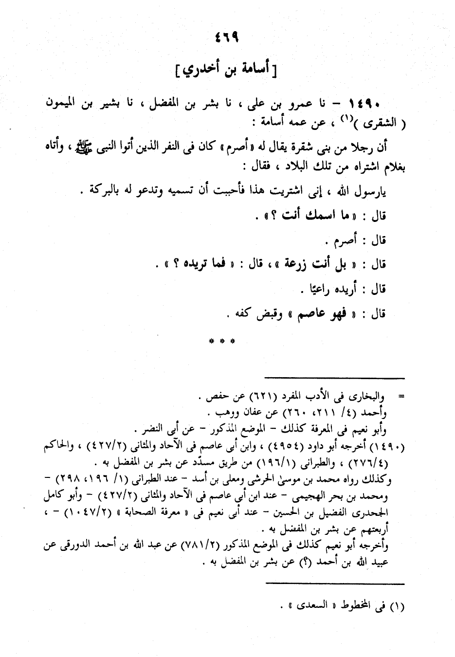 1490 - نَا عَمْرُو بْنُ عَلِيٍّ، نَا بِشْرُ بْنُ الْمُفَضَّلِ، نَا بَشِيرُ بْنُ الْمَيْمُونِ الشَّقَرِيُّ، عَنْ عَمِّهِ أُسَامَةَ، أَنَّ رَجُلًا مِنْ بَنِي شَقْرَةَ يُقَالُ لَهُ: أَصْرَمُ كَانَ فِي النَّفْرِ الَّذِينَ أَتَوُا النَّبِيَّ صَلَّى اللهُ عَلَيْهِ وَسَلَّمَ، وَأَتَاهُ بِغُلَامٍ اشْتَرَاهُ مِنْ تِلْكَ الْبِلَادِ، فَقَالَ: يَا رَسُولَ اللَّهِ، إِنِّي اشْتَرَيْتُ هَذَا، فَأَحْبَبْتُ أَنْ تُسَمِّيَهُ وَتَدْعُوَ لَهُ بِالْبَرَكَةِ، قَالَ: «مَا اسْمُكَ أَنْتَ؟» ، قَالَ: أَصْرَمُ، قَالَ: «§بَلْ أَنْتَ زُرْعَةُ» ، قَالَ: «فَمَا تُرِيدُهُ؟» ، قَالَ: أُرِيدُهُ رَاعِيًا، قَالَ: «فَهُوَ عَاصِمٌ» ، وَقَبَضَ كَفَّهُ