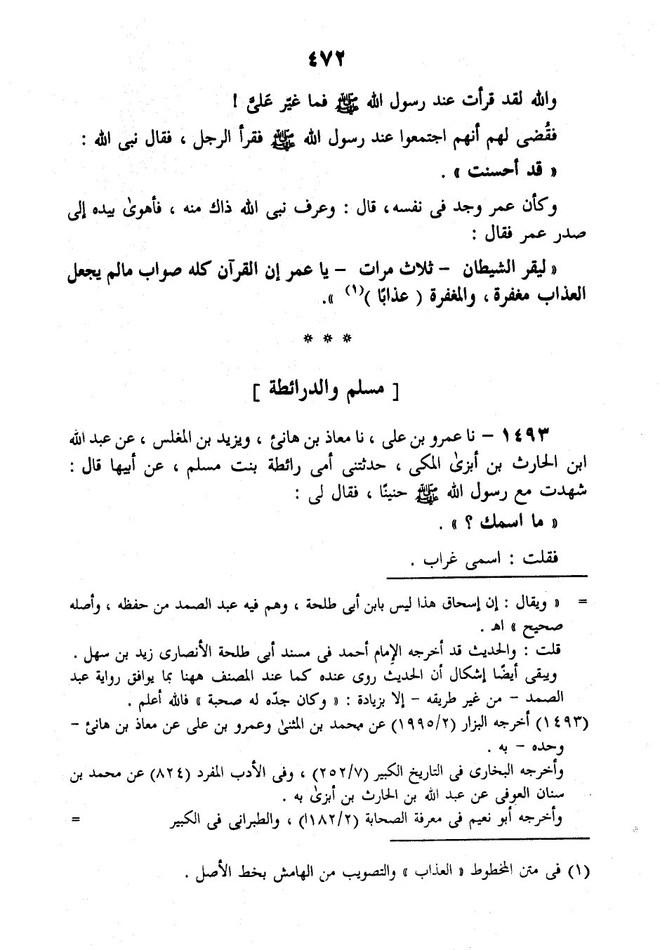 1493 - نَا عَمْرُو بْنُ عَلِيٍّ، نَا مُعَاذُ بْنُ هَانِئٍ، وَيَزِيدُ بْنُ الْمُغَلِّسِ، عَنْ عَبْدِ اللَّهِ بْنِ الْحَارِثِ بْنِ أَبْزَى الْمَكِّيِّ , حَدَّثَتْنِي أُمِّي رَائِطَةُ بِنْتُ مُسْلِمٍ، عَنْ أَبِيهَا قَالَ: شَهِدْتُ مَعَ رَسُولِ اللَّهِ صَلَّى اللهُ عَلَيْهِ وَسَلَّمَ حُنَيْنًا فَقَالَ لِي: «مَا اسْمُكَ؟» . فَقُلْتُ: اسْمِي غُرَابٌ، فَقَالَ: «لَا، §اسْمُكَ مُسْلِمٌ»