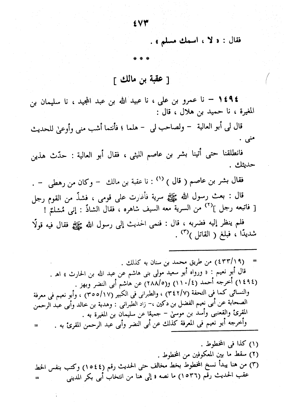 1494 - نَا عَمْرُو بْنُ عَلِيٍّ، نَا عُبَيْدُ اللَّهِ بْنُ عَبْدِ الْمَجِيدِ، نَا سُلَيْمَانُ بْنُ الْمُغِيرَةِ، نَا حُمَيْدُ بْنُ هِلَالٍ قَالَ: قَالَ لِي أَبُو الْعَالِيَةِ وَلِصَاحِبٍ لِي: هَلُمَّا، فَأَنْتَمَا أَشَبُّ مِنِّي، وَأَوْعَى لِلْحَدِيثِ مِنِّي، فَانْطَلَقْنَا حَتَّى أَتَيْنَا بِشْرَ بْنَ عَاصِمٍ اللَّيْثِيَّ فَقَالَ أَبُو الْعَالِيَةِ: حَدِّثْ هَذَيْنِ حَدِيثَكَ، فَقَالَ بِشْرُ بْنُ عَاصِمٍ قَالَ: نَا عُقْبَةُ بْنُ مَالِكٍ وَكَانَ مِنْ رَهْطِي قَالَ: بَعَثَ رَسُولُ اللَّهِ صَلَّى اللهُ عَلَيْهِ وَسَلَّمَ سَرِيَّةً فَأَغَارَتْ عَلَى قَوْمِي، فَشَذَّ مِنَ الْقَوْمِ رَجُلٌ، فَاتَّبَعَهُ رَجُلٌ مِنَ السَّرِيَّةِ مَعَهُ السَّيْفُ شَاهِرُهُ، فَقَالَ الشَّاذُّ: إِنِّي مُسْلِمٌ، فَلَمْ يَنْظُرْ إِلَيْهِ فَضَرَبَهُ قَالَ: فَنَمَى الْحَدِيثُ إِلَى رَسُولِ اللَّهِ صَلَّى اللهُ عَلَيْهِ وَسَلَّمَ، فَقَالَ فِيهِ قَوْلًا شَدِيدًا فَبَلَغَ الْقَاتِلَ -[474]- قَالَ: فَبَيْنَمَا رَسُولُ اللَّهِ صَلَّى اللهُ عَلَيْهِ وَسَلَّمَ يَخْطُبُ إِذْ قَالَ الْقَاتِلُ: وَاللَّهِ يَا رَسُولَ اللَّهِ مَا قَالَ إِلَّا مُتَعَوِّذًا مِنَ الْقَتْلِ، فَأَعْرَضَ رَسُولُ اللَّهِ صَلَّى اللهُ عَلَيْهِ وَسَلَّمَ عَنْهُ، وَعَمَّنْ قِبَلَهُ مِنَ النَّاسِ وَأَخَذَ فِي خُطْبَتِهِ، فَلَمْ يَصْبِرْ أَنْ قَالَ: وَاللَّهِ مَا قَالَ ذَاكَ إِلَّا مُتَعَوِّذًا مِنَ الْقَتْلِ، فَأَعْرَضَ عَنْهُ وَعَمَّنْ قِبَلَهُ مِنَ النَّاسِ، وَأَخَذَ فِي خُطْبَتِهِ، ثُمَّ لَمْ يَصْبِرْ فَقَالَ الثَّالِثَةَ: يَا رَسُولَ اللَّهِ، وَاللَّهِ مَا قَالَ إِلَّا مُتَعَوِّذًا مِنَ الْقَتْلِ، فَأَقْبَلَ عَلَيْهِ رَسُولُ اللَّهِ صَلَّى اللهُ عَلَيْهِ وَسَلَّمَ، فَقَالَ: «إِنَّ §اللَّهَ أَبَى عَلَيَّ لِمَنْ قَتَلَ مُؤْمِنًا» ، قَالَهَا ثَلَاثًا