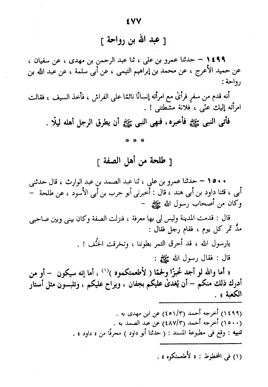 1500 - حَدَّثَنَا عَمْرُو بْنُ عَلِيٍّ، ثنا عَبْدُ الصَّمَدِ بْنُ عَبْدِ الْوَارِثِ , قَالَ: حَدَّثَنِي أَبِي، قثَنَا دَاوُدُ بْنُ أَبِي هِنْدَ قَالَ: أَخْبَرَنِي أَبُو حَرْبِ بْنُ أَبِي الْأَسْوَدِ، عَنْ طَلْحَةَ وَكَانَ مِنْ أَصْحَابِ رَسُولِ اللَّهِ صَلَّى اللهُ عَلَيْهِ وَسَلَّمَ قَالَ: قَدِمْتُ الْمَدِينَةَ وَلَيْسَ لِي بِهَا مَعْرِفَةٌ، فَنَزَلَتُ الصُّفَّةَ وَكَانَ بَيْنِي، وَبَيْنَ صَاحِبِي مُدُّ تَمْرٍ كُلَّ يَوْمٍ، فَقَامَ رَجُلٌ فَقَالَ: يَا رَسُولَ اللَّهِ، قَدْ أَحْرَقَ التَّمْرُ بُطُونَنَا وَتَخَرَّقَتِ الْخُنُفُ، قَالَ: فَقَالَ رَسُولُ اللَّهِ صَلَّى اللهُ عَلَيْهِ وَسَلَّمَ: «أَمَا وَاللَّهِ §لَوْ أَجِدُ خُبْزًا وَلَحْمًا لَأَطْعَمْتُكُمُوهُ، أَمَا إِنَّهُ سَيَكُونُ أَوْ مَنْ أَدْرَكَ ذَلِكَ مِنْكُمْ أَنْ يُغْدَى عَلَيْكُمْ بِجِفَانٍ وَيُرَاحُ عَلَيْكُمْ، وَتَلْبَسُونَ مِثْلَ أَسْتَارِ الْكَعْبَةِ» -[478]-. فَمَكَثْتُ أَنَا وَصَاحِبِي ثَمَانِيَ عَشْرَةَ لَيْلَةً مَا لَنَا طَعَامٌ إِلَّا التَّمْرُ، حَتَّى قَدِمْنَا عَلَى إِخْوَانِنَا مِنَ الْأَنْصَارِ فَوَاسَوْنَا، وَكَانَ خَيْرُ مَا أَصَبْنَا هَذَا التَّمْرَ