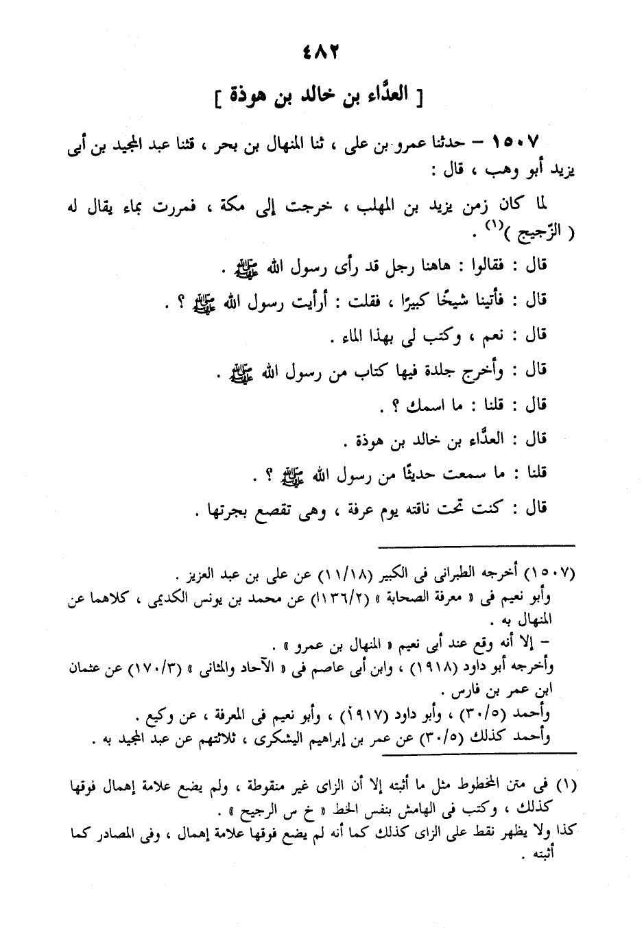1507 - حَدَّثَنَا عَمْرُو بْنُ عَلِيٍّ، ثنا الْمِنْهَالُ بْنُ بَحْرٍ، قَثَنَا عَبْدُ الْمَجِيدِ بْنُ أَبِي يَزِيدَ أَبُو وَهْبٍ، قَالَ: لَمَّا كَانَ زَمَنُ يَزِيدَ بْنِ الْمُهَلَّبِ خَرَجْتُ إِلَى مَكَّةَ؛ فَمَرَرْتُ بِمَاءٍ يُقَالُ لَهُ: الزُّجَيْجُ، قَالَ: فَقَالُوا: هَاهُنَا رَجُلٌ قَدْ رَأَى رَسُولَ اللَّهِ صَلَّى اللهُ عَلَيْهِ وَسَلَّمَ، قَالَ: فَأَتَيْنَا شَيْخًا كَبِيرًا، فَقُلْتُ: أَرَأَيْتَ رَسُولَ اللَّهِ صَلَّى اللهُ عَلَيْهِ وَسَلَّمَ؟، قَالَ: نَعَمْ، وَكَتَبَ لِي بِهَذَا الْمَاءِ، قَالَ: وَأَخْرَجَ جِلْدَةً فِيهَا كِتَابٌ مِنْ رَسُولِ اللَّهِ صَلَّى اللهُ عَلَيْهِ وَسَلَّمَ، قَالَ: قُلْنَا: مَا اسْمُكَ؟، قَالَ: الْعَدَّاءُ بْنُ خَالِدِ بْنِ هَوْذَةَ، قُلْنَا: مَا سَمِعْتَ حَدِيثًا مِنْ رَسُولِ اللَّهِ صَلَّى اللهُ عَلَيْهِ وَسَلَّمَ؟ قَالَ: كُنْتُ تَحْتَ نَاقَتِهِ يَوْمَ عَرَفَةَ وَهِيَ تَقْصَعُ بِجِرَّتِهَا -[483]- فَقَالَ: «يَا أَيُّهَا النَّاسُ أَيُّ يَوْمٍ هَذَا، وَأَيُّ شَهْرٍ هَذَا، وَأَيُّ بَلَدٍ هَذَا؟» ، قَالَ: قُلْنَا: اللَّهُ أَعْلَمُ، قَالَ: «أَلَيْسَ الشَّهْرَ الْحَرَامَ، وَالْبَلَدَ الْحَرَامَ، وَالْيَوْمَ الْحَرَامَ؟» ، قُلْنَا: نَعَمْ، قَالَ: «أَلَا إِنَّ §دِمَاءَكُمْ وَأَمْوَالَكُمْ، وَأَعْرَاضَكُمْ عَلَيْكُمْ حَرَامٌ كَحُرْمَةِ يَوْمِكُمْ هَذَا مِنْ شَهْرِكُمْ هَذَا فِي بَلَدِكُمْ هَذَا إِلَى يَوْمِ تَلْقَوْنَ رَبَّكُمْ، اللَّهُمَّ هَلْ بَلَّغْتُ، اللَّهُمَّ اشْهَدْ»