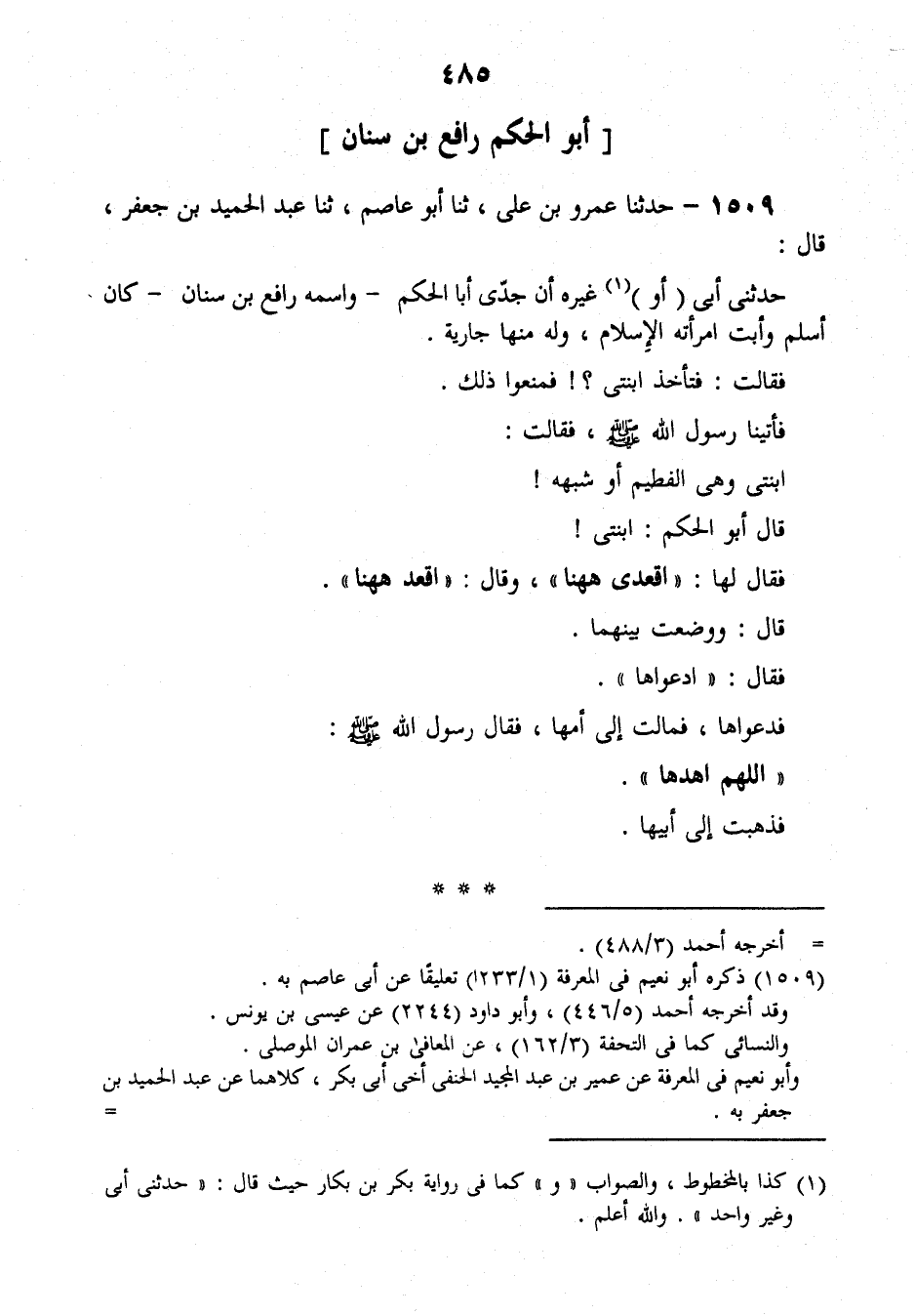 1509 - حَدَّثَنَا عَمْرُو بْنُ عَلِيٍّ، ثنا أَبُو عَاصِمٍ , ثنا عَبْدُ الْحَمِيدِ بْنُ جَعْفَرٍ , قَالَ: حَدَّثَنِي أَبِي، أَوْ غَيْرُهُ أَنَّ جَدِّي أَبَا الْحَكَمِ وَاسْمُهُ رَافِعُ بْنُ سِنَانَ كَانَ أَسْلَمَ وَأَبَتِ امْرَأَتُهُ الْإِسْلَامَ، وَلَهُ مِنْهَا جَارِيَةٌ، فَقَالَتْ: فَتَأْخُذُ ابْنَتِي؟، فَمَنَعُوا ذَلِكَ، فَأَتَيْنَا رَسُولَ اللَّهِ صَلَّى اللهُ عَلَيْهِ وَسَلَّمَ فَقَالَتِ: ابْنَتِي، وَهِيَ الْفَطِيمُ أَوْ شَبَهُهُ، قَالَ أَبُو الْحَكَمِ: ابْنَتِي، فَقَالَ لَهَا: «اقْعُدِي هَاهُنَا» ، وَقَالَ: «اقْعُدْ هَاهُنَا» ، قَالَ: وَوُضِعَتْ بَيْنَهُمَا، فَقَالَ: «ادْعُوَاهَا» ، فَدَعَوَاهَا، فَمَالَتْ إِلَى أُمِّهَا، فَقَالَ رَسُولُ اللَّهِ صَلَّى اللهُ عَلَيْهِ وَسَلَّمَ: «§اللَّهُمَّ اهْدِهَا» ، فَذَهَبَتْ إِلَى أَبِيهَا