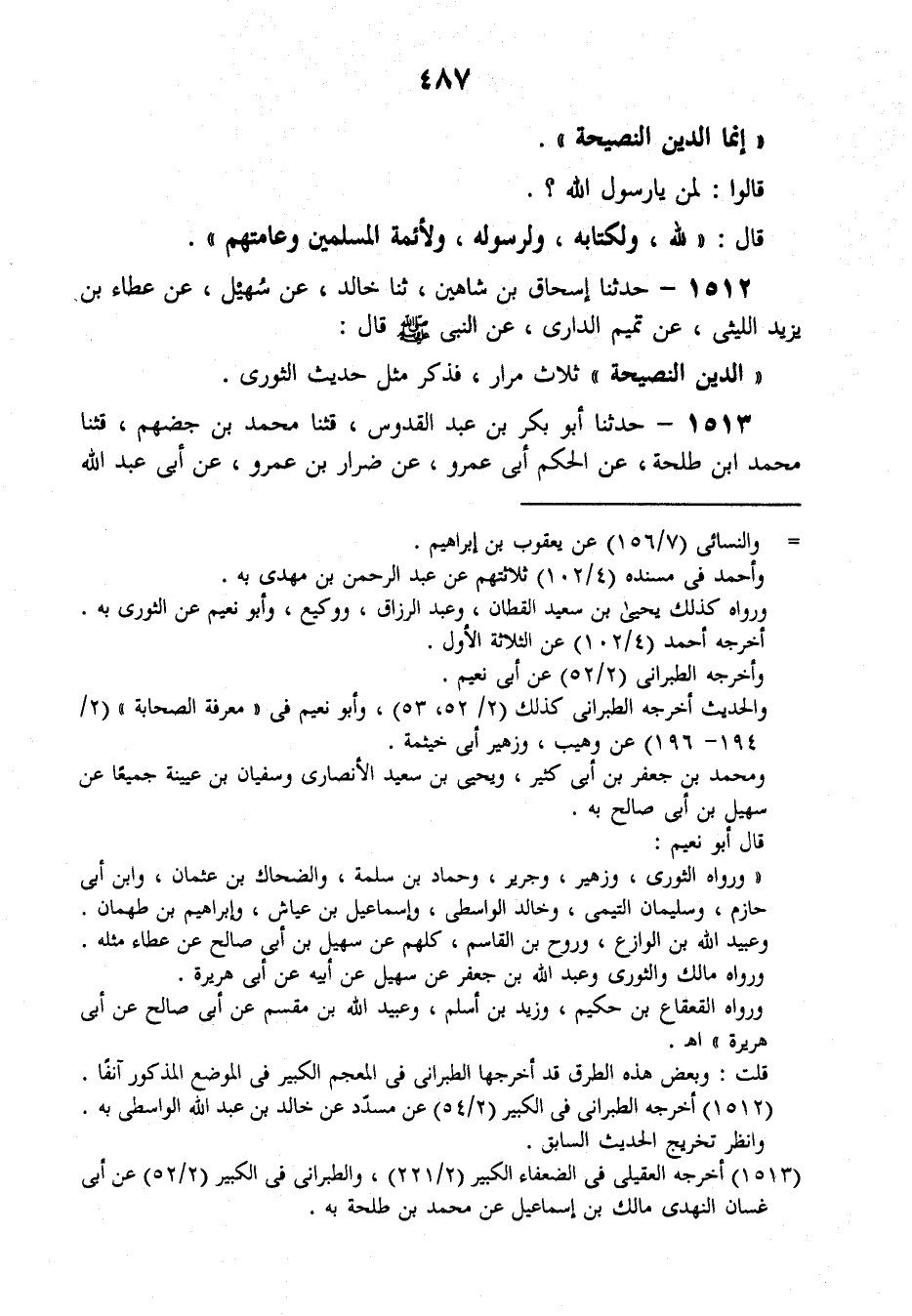 1513 - حَدَّثَنَا أَبُو بَكْرِ بْنُ عَبْدِ الْقُدُّوسِ , قَثَنَا مُحَمَّدُ بْنُ جَهْضَمٍ، قَثَنَا مُحَمَّدُ بْنُ طَلْحَةَ، عَنِ الْحَكَمِ أَبِي عَمْرٍو , عَنْ ضِرَارِ بْنِ عَمْرٍو، عَنْ أَبِي عَبْدِ اللَّهِ الشَّامِيِّ , عَنْ تَمِيمٍ الدَّارِيِّ قَالَ رَسُولُ اللَّهِ صَلَّى اللهُ عَلَيْهِ وَسَلَّمَ: «§حَقُّ الزَّوْجِ عَلَى الْمَرْأَةِ أَنْ تَبَرَّ قَسَمَهُ، وَأَنْ لَا تَهْجُرَ فِرَاشَهُ، وَأَنْ تُطِيعَ أَمْرَهُ، وَأَنْ لَا تَخْرُجَ إِلَّا بِإِذْنِهِ، وَلَا يَدْخُلَ عَلَيْهَا مَنْ يَكْرَهُ»
