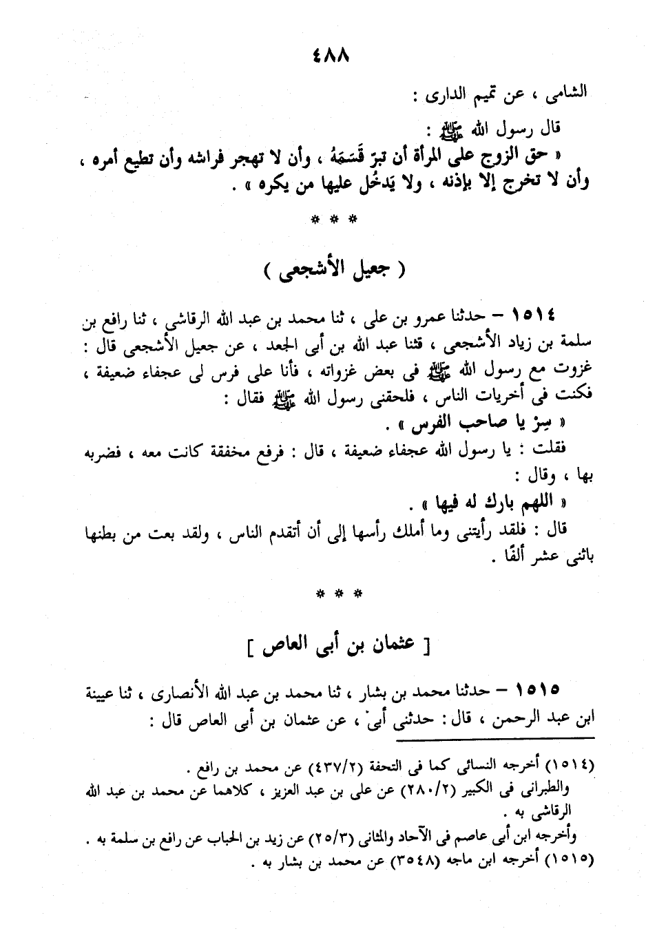 1515 - حَدَّثَنَا مُحَمَّدُ بْنُ بَشَّارٍ، ثنا مُحَمَّدُ بْنُ عَبْدِ اللَّهِ الْأَنْصَارِيُّ، ثنا عُيَيْنَةُ بْنُ عَبْدِ الرَّحْمَنِ قَالَ: حَدَّثَنِي أَبِي عَنْ عُثْمَانَ بْنِ أَبِي الْعَاصِ قَالَ -[489]-: اسْتَعْمَلَنِي النَّبِيُّ صَلَّى اللهُ عَلَيْهِ وَسَلَّمَ عَلَى الطَّائِفِ، فَجَعَلَ يَعْرِضُ لِي شَيْءٌ فِي صَلَاتِي حَتَّى مَا أَدْرِي مَا أُصَلِّي، فَلَمَّا رَأَيْتُ ذَلِكَ دَخَلْتُ عَلَى رَسُولِ اللَّهِ صَلَّى اللهُ عَلَيْهِ وَسَلَّمَ قَالَ: «ابْنَ أَبِي الْعَاصِ؟» ، قُلْتُ: نَعَمْ، قَالَ: «مَا شَأْنُكَ؟» ، قُلْتُ: يَا رَسُولَ اللَّهِ، عَرَضَ لِي فِي صَلَاتِي حَتَّى مَا أَدْرِي مَا أُصَلِّي، قَالَ: «ذَاكَ الشَّيْطَانُ، ادْنُهْ» ، فَدَنَوْتُ مِنْهُ فَجَلَسْتُ عَلَى صُدُورِ قَدَمَيِّ، فَضَرَبَ صَدْرِي بِيَدِهِ، وَتَفَلَ فِي فِيَّ، وَقَالَ: «§اخْرُجْ عَدُوَّ اللَّهِ، ثَلَاثَ مِرَارٍ» ، قَالَ: «الْحَقْ بِعَمَلِكَ» ، قَالَ عُثْمَانُ: فَلَعَمْرِي مَا أَحْسَبُهُ خَاءَ بَطْنِي بَعْدُ