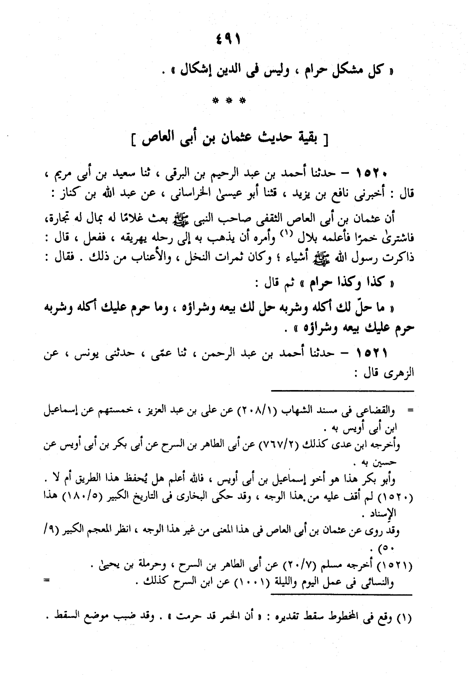 1520 - حَدَّثَنَا أَحْمَدُ بْنُ عَبْدِ الرَّحِيمِ بْنِ الْبَرْقِيِّ، ثنا سَعِيدُ بْنُ أَبِي مَرْيَمَ قَالَ: أَخْبَرَنِي نَافِعُ بْنُ يَزِيدَ، قَثَنَا أَبُو عِيسَى الْخُرَاسَانِيُّ، عَنْ عَبْدِ اللَّهِ بْنِ كَنَّازٍ، أَنَّ عُثْمَانَ بْنَ أَبِي الْعَاصِ الثَّقَفِيَّ صَاحِبَ النَّبِيِّ صَلَّى اللهُ عَلَيْهِ وَسَلَّمَ بَعَثَ غُلَامًا لَهُ بِمَالٍ لَهُ تِجَارَةً؛ فَاشْتَرَى خَمْرًا، فَأَعْلَمَهُ بِلَالٌ وَأَمَرَهُ أَنْ يَذْهَبَ بِهِ إِلَى رَحْلِهِ يُهْرِيقُهُ فَفَعَلَ، قَالَ: ذَاكَرْتُ رَسُولَ اللَّهِ صَلَّى اللهُ عَلَيْهِ وَسَلَّمَ أَشْيَاءَ، وَكَانَ ثَمَرَاتُ النَّخْلِ وَالْأَعْنَابِ مِنْ ذَلِكَ، فَقَالَ: «كَذَا وَكَذَا حَرَامٌ» ، ثُمَّ قَالَ: «§مَا حَلَّ لَكَ أَكْلُهُ وَشُرْبُهُ حَلَّ لَكَ بَيْعُهُ وَشِرَاؤُهُ، وَمَا حُرِّمَ عَلَيْكَ أَكْلُهُ، وَشُرْبُهُ حُرِّمَ عَلَيْكَ بَيْعُهُ وَشِرَاؤُهُ»