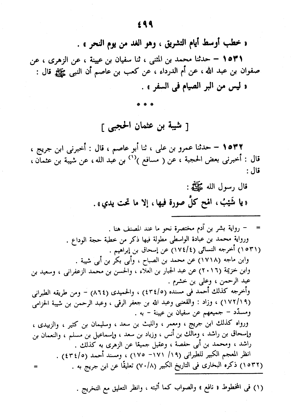 1532 - حَدَّثَنَا عَمْرُو بْنُ عَلِيٍّ، ثنا أَبُو عَاصِمٍ , قَالَ: أَخْبَرَنِي ابْنُ جُرَيْجٍ , قَالَ: أَخْبَرَنِي بَعْضُ، الْحَجَبَةِ، عَنْ مُسَافِعِ بْنِ عَبْدِ اللَّهِ، عَنْ شَيْبَةَ بْنِ عُثْمَانَ قَالَ: قَالَ رَسُولُ اللَّهِ صَلَّى اللهُ عَلَيْهِ وَسَلَّمَ: يَا شَيْبُ، §امْحُ كُلَّ صُورَةٍ فِيهَا إِلَّا مَا تَحْتَ يَدِي "، فَرَفَعَ يَدَهُ عَنْ عِيسَى، وَأُمِّهِ