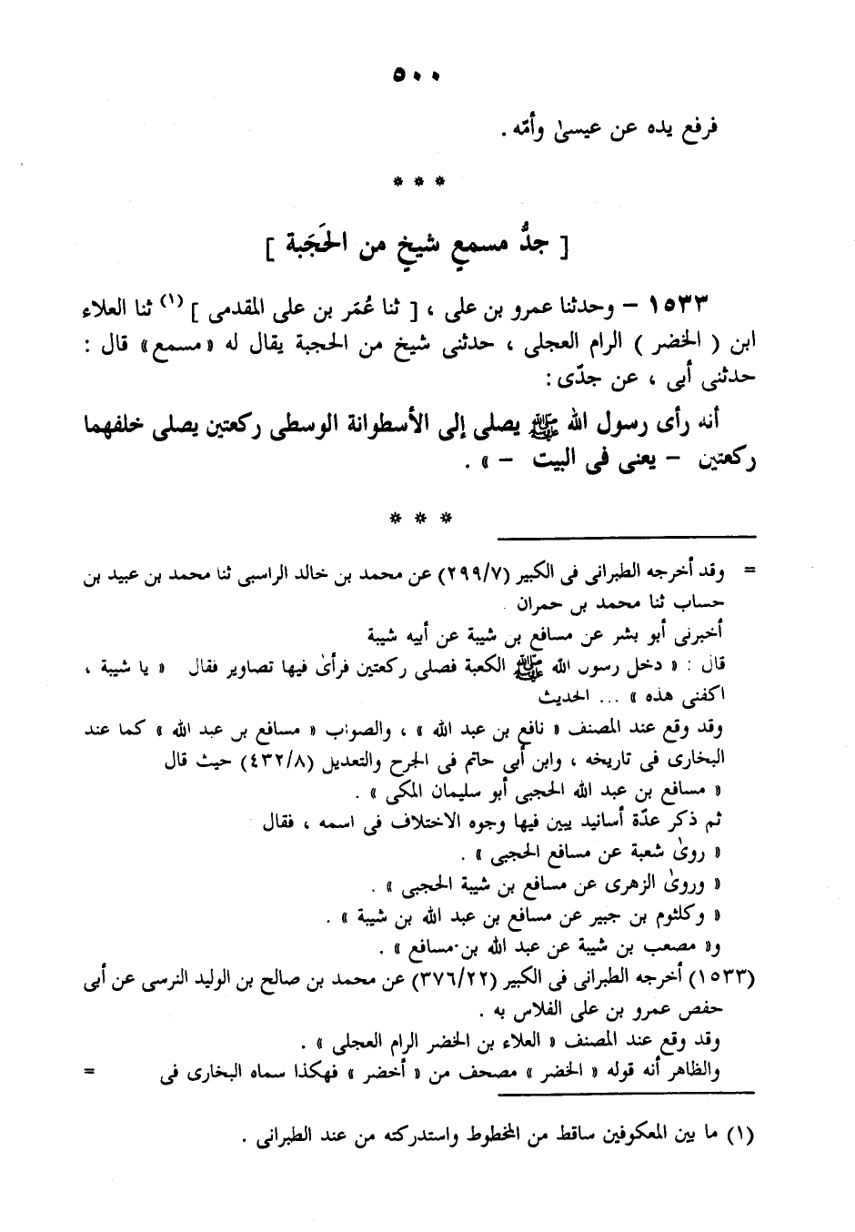 1533 - وَحَدَّثَنَا عَمْرُو بْنُ عَلِيٍّ، ثنا عُمَرُ بْنُ عَلِيٍّ الْمُقَدَّمِيُّ، ثنا الْعَلَاءُ بْنُ الْخَضِرِ الرَّامُّ الْعِجْلِيُّ , حَدَّثَنِي شَيْخٌ مِنَ الْحَجَبَةِ يُقَالُ لَهُ: مِسْمَعٌ قَالَ: حَدَّثَنِي أَبِي، عَنْ جَدِّي أَنَّهُ رَأَى رَسُولَ اللَّهِ صَلَّى اللهُ عَلَيْهِ وَسَلَّمَ §يُصَلِّي إِلَى الْأُسْطُوَانَةِ الْوُسْطَى رَكْعَتَيْنِ، يُصَلَّى خَلْفَهُمَا رَكْعَتَيْنِ، يَعْنِي فِي الْبَيْتِ