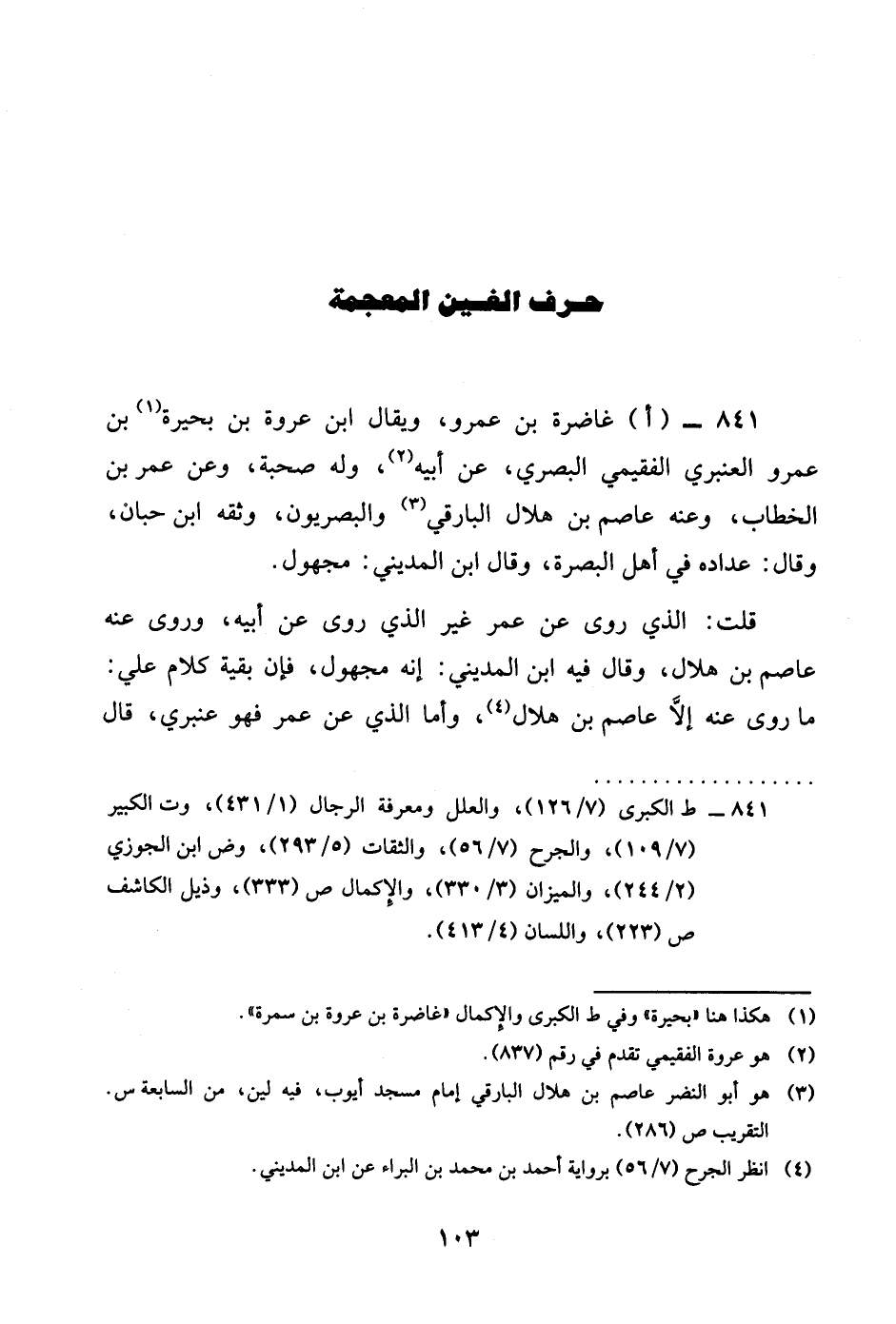 842 - اغاضرة بن عَمْرو وَيُقَال بن عُرْوَة بن بحيرة بن عَمْرو الْعَنْبَري الْفُقيْمِي الْبَصْرِيّ عَن أَبِيه وَله صُحْبَة وَعَن عمر بن الْخطاب رضى الله تَعَالَى عَنهُ وَعنهُ عَاصِم بن هِلَال الْبَارِقي والبصريون وَثَّقَهُ بن حبَان وَقَالَ عداده فِي أهل الْبَصْرَة وَقَالَ بن الْمَدِينِيّ مَجْهُول قلت الَّذِي روى عَن عمر غير الَّذِي روى عَن أَبِيه وروى عَنهُ عَاصِم بن هِلَال وَقَالَ فِيهِ بن الْمَدِينِيّ أَنه مَجْهُول فَإِن بَقِيَّة كَلَام عَليّ مَا روى عَنهُ إِلَّا عَاصِم بن هِلَال وَأما الَّذِي عَن عمر فَهُوَ عنبري قَالَ