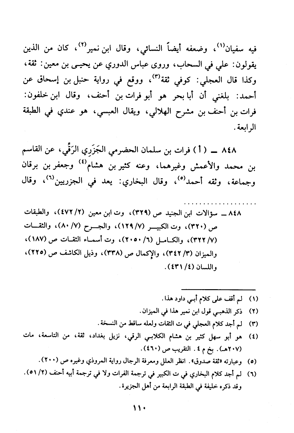 848 - افرات بن سلمَان الْحَضْرَمِيّ الْجَزرِي الرقي عَن الْقَاسِم بن مُحَمَّد وَالْأَعْمَش وَغَيرهمَا وَعنهُ كثير بن هِشَام وجعفر بن برْقَان وَجَمَاعَة وَثَّقَهُ أَحْمد وَقَالَ البُخَارِيّ يعد فِي الجزريين وَقَالَ