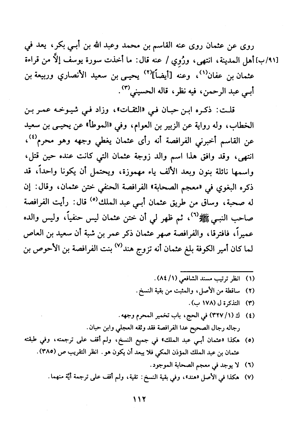 روى عَن عُثْمَان رضى الله تَعَالَى عَنهُ روى عَنهُ الْقَاسِم بن مُحَمَّد وَعبد الله بن أبي بكر يعد فِي أهل الْمَدِينَة انْتهى وروى قَالَ مَا أخذت سُورَة يُوسُف إِلَّا من قِرَاءَة عُثْمَان بن عَفَّان رضى الله تَعَالَى عَنهُ وَعنهُ أَيْضا يحيى بن سعيد الْأنْصَارِيّ وَرَبِيعَة بن أبي عبد الرَّحْمَن فِيهِ نظر قَالَه الْحُسَيْنِي قلت ذكره بن حبَان فِي الثِّقَات وَزَاد فِي شُيُوخه عمر بن الْخطاب رضى الله تَعَالَى عَنهُ وَله رِوَايَة عَن الزبير بن الْعَوام رضى الله تَعَالَى عَنهُ وَفِي الْمُوَطَّأ عَن يحيى بن سعيد عَن الْقَاسِم أَخْبرنِي الفرافصة أَنه رأى عُثْمَان يُغطي وَجهه وَهُوَ محرم انْتهى وَقد وَافق هَذَا اسْم وَالِد زَوْجَة عُثْمَان الَّتِي كَانَت عِنْده حِين قتل وَاسْمهَا نائلة بنُون وَبعد الْألف يَاء مَهْمُوزَة وَيحْتَمل أَن يَكُونَا وَاحِدًا قد ذكره الْبَغَوِيّ فِي مُعْجم الصَّحَابَة الفرافضة الْحَنَفِيّ ختن عُثْمَان وَقَالَ إِن لَهُ صُحْبَة وسَاق من طَرِيق عُثْمَان أبي عبد الْملك قَالَ رَأَيْت الفرافصة صَاحب النَّبِي صلى الله عَلَيْهِ وَسلم ثمَّ ظهر لي أَن ختن عُثْمَان لَيْسَ حنفيا وَلَيْسَ وَالِده عُمَيْرًا فَافْتَرقَا والفرافصة صهر عُثْمَان ذكر عمر بن شبة أَن سعيد بن الْعَاصِ لما كَانَ أَمِير الْكُوفَة بلغ عُثْمَان أَنه تزوج هِنْد بنت الفرافصة بن الْأَحْوَص