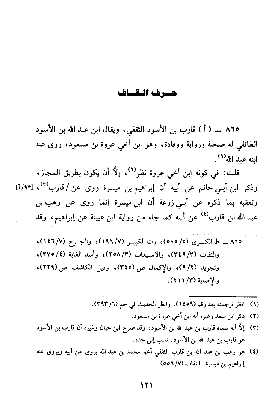 866 - اقَارب بن الْأسود الثَّقَفِيّ وَيُقَال بن عبد الله بن الْأسود الطَّائِفِي لَهُ صُحْبَة وَرِوَايَة ووفادة وَهُوَ بن أخي عُرْوَة بن مَسْعُود روى عَنهُ ابْنه عبد الله قلت فِي كَونه بن أخي عُرْوَة نظر إِلَّا أَن يكون بطرِيق الْمجَاز وَذكر بن أبي حَاتِم عَن أَبِيه أَن إِبْرَاهِيم بن ميسرَة روى عَن قَارب وَتعقبه بِمَا ذكره عَن أبي زرْعَة أَن بن ميسرَة إِنَّمَا روى عَن وهب بن عبد الله بن قَارب عَن أَبِيه كَمَا جَاءَ من رِوَايَة بن عُيَيْنَة عَن إِبْرَاهِيم وَقد