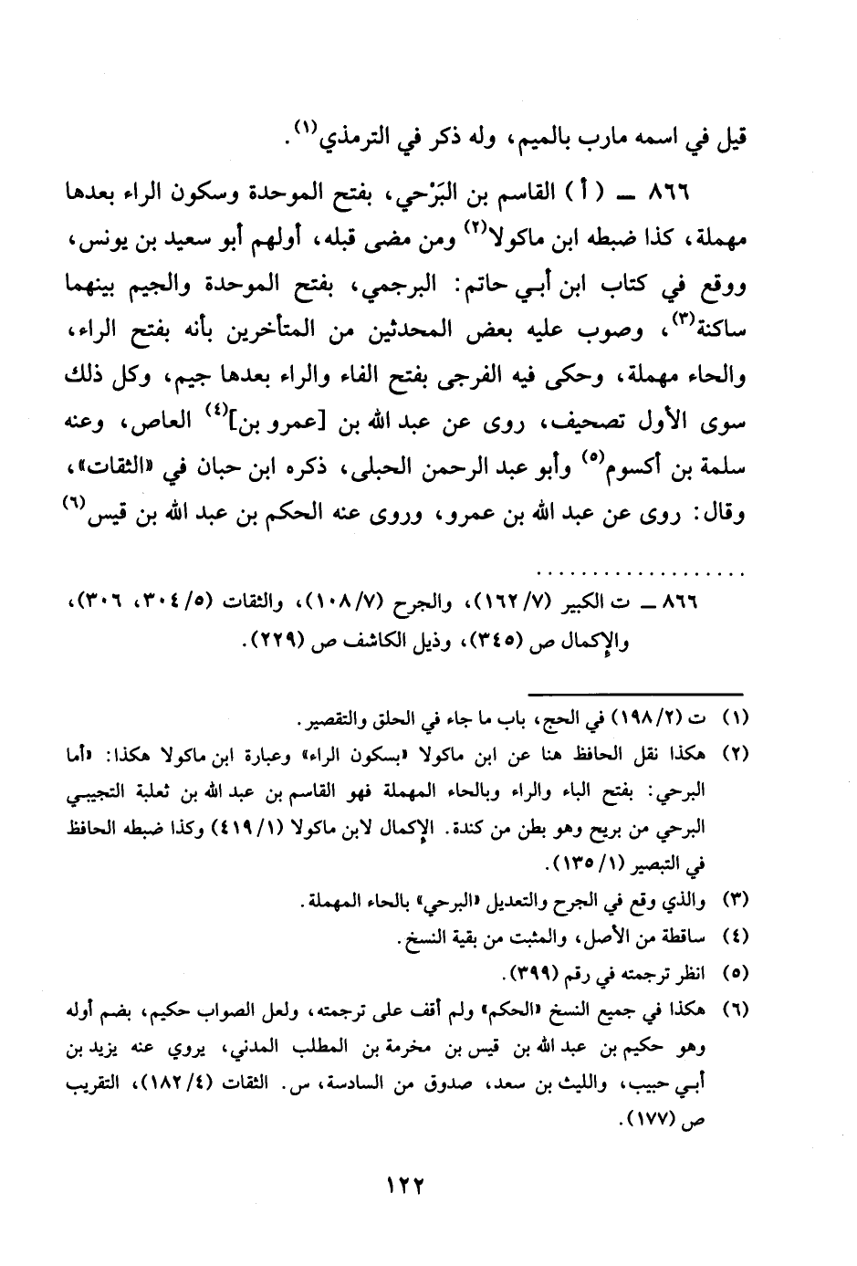 867 - االْقَاسِم بن البرحي بِفَتْح الْمُوَحدَة وَسُكُون الرَّاء بعْدهَا مُهْملَة كَذَا ضَبطه بن مَاكُولَا وَمن مضى قبله أَوَّلهمْ أَبُو سعيد بن يُونُس وَوَقع فِي كتاب بن أبي حَاتِم البرجمي بِضَم الْمُوَحدَة وَالْجِيم بَينهمَا رَاء سَاكِنة وَصوب عَلَيْهِ بعض الْمُحدثين من الْمُتَأَخِّرين بِأَنَّهُ بِفَتْح الرَّاء والحاء الْمُهْملَة وَحكى فِيهِ الْفَرَجِيِّ بِفَتْح الْفَاء وَالرَّاء بعْدهَا جِيم وكل ذَلِك سوى الأول تَصْحِيف روى عَن عبد الله بن عَمْرو بن الْعَاصِ وَعنهُ سَلمَة بن أكسوم وَأَبُو عبد الرَّحْمَن الحبلى ذكره بن حبَان فِي الثِّقَات وَقَالَ روى عَن عبد الله بن عَمْرو وروى عَنهُ الحكم بن عبد الله بن قيس