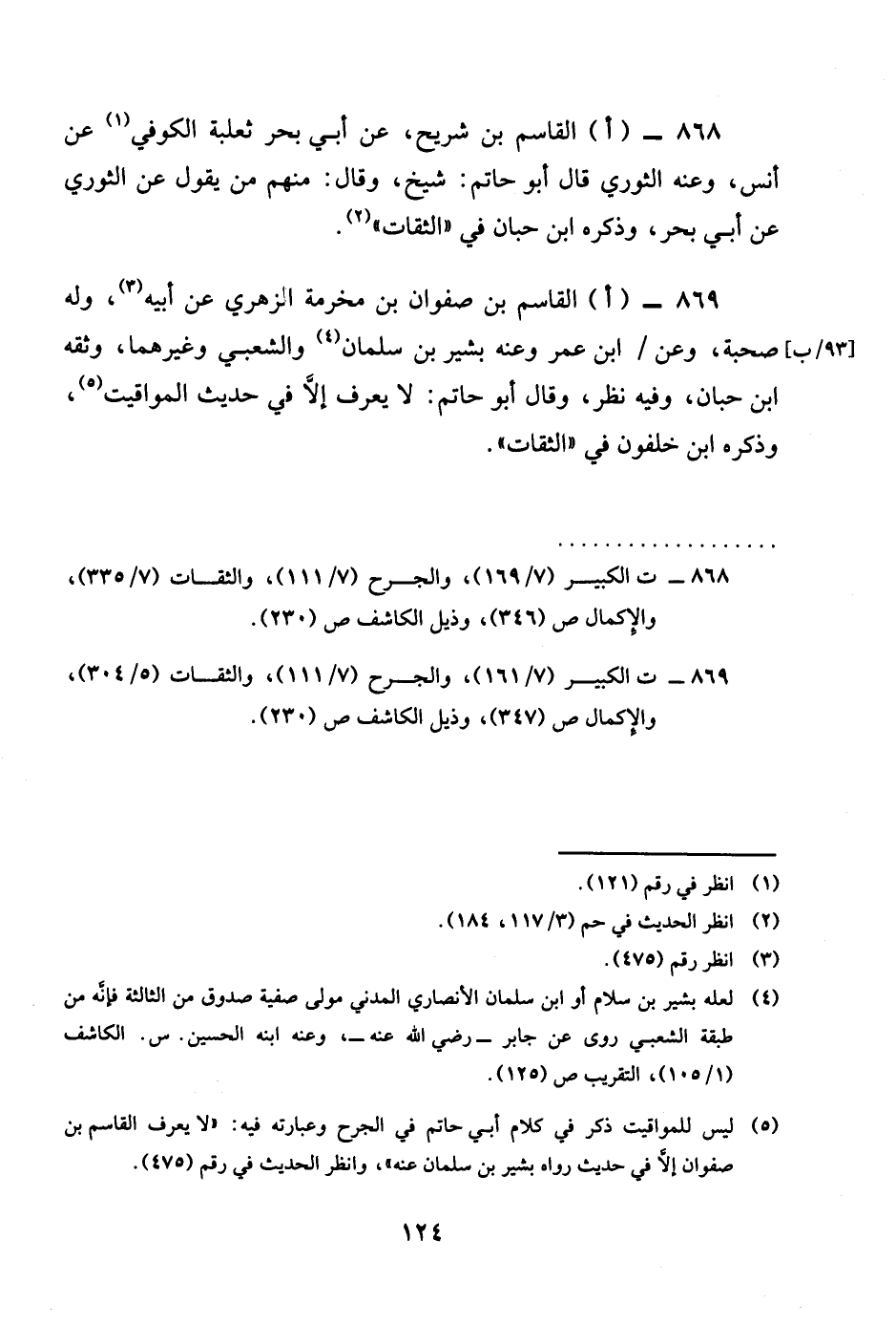 869 - االْقَاسِم بن شُرَيْح عَن أبي بَحر ثَعْلَبَة الْكُوفِي عَن أنس وَعنهُ الثَّوْريّ قَالَ أَبُو حَاتِم شيخ وَقَالَ مِنْهُم من يَقُول عَن الثَّوْريّ عَن أبي بَحر وَذكره بن حبَان فِي الثِّقَات