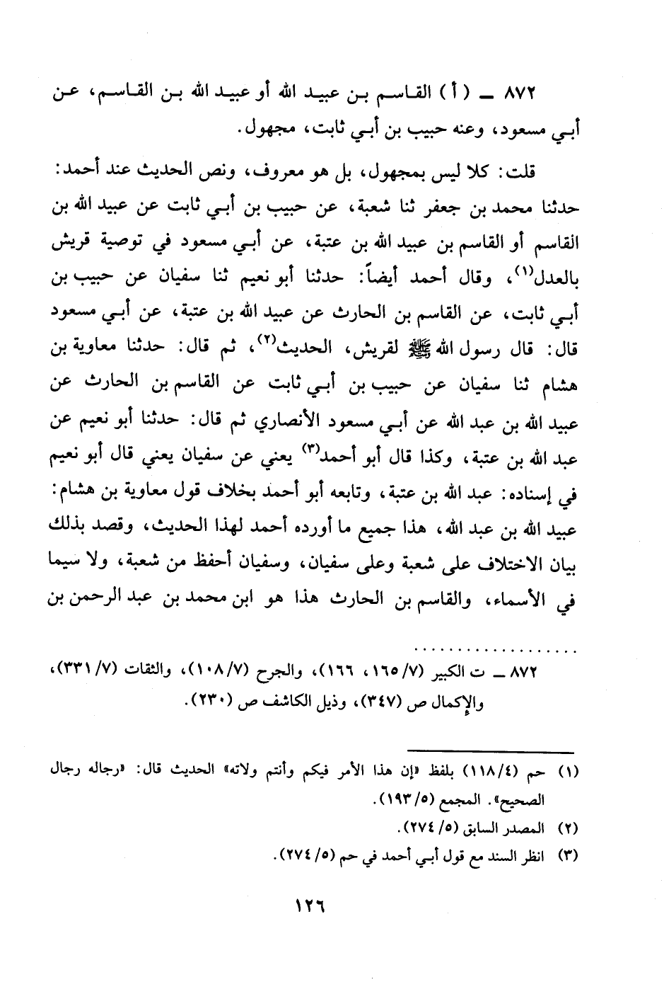 873 - االْقَاسِم بن عبيد الله أَو عبيد الله بن الْقَاسِم عَن أبي مَسْعُود رضى الله تَعَالَى عَنهُ وَعنهُ حبيب بن أبي ثَابت مَجْهُول قلت كلا لَيْسَ بِمَجْهُول بل هُوَ مَعْرُوف وَنَصّ الحَدِيث عِنْد أَحْمد حَدثنَا مُحَمَّد بن جَعْفَر ثَنَا شُعْبَة عَن حبيب بن أبي ثَابت عَن عبيد الله بن الْقَاسِم أَو الْقَاسِم بن عبيد الله بن عتبَة عَن أبي مَسْعُود فِي توصية قُرَيْش بِالْعَدْلِ وَقَالَ أَحْمد أَيْضا حَدثنَا أَبُو نعيم ثَنَا سُفْيَان عَن حبيب بن أبي ثَابت عَن الْقَاسِم بن الْحَارِث عَن عبيد الله بن عتبَة عَن أبي مَسْعُود قَالَ قَالَ رَسُول الله صلى الله عَلَيْهِ وَسلم لقريش الحَدِيث ثمَّ قَالَ حَدثنَا مُعَاوِيَة بن هِشَام ثَنَا سُفْيَان عَن حبيب بن أبي ثَابت عَن الْقَاسِم بن الْحَارِث عَن عبيد الله بن عبد الله عَن أبي مَسْعُود الْأنْصَارِيّ ثمَّ قَالَ حَدثنَا أَبُو نعيم عَن عبد الله بن عتبَة وَكَذَا قَالَ أَبُو أَحْمد يَعْنِي عَن سُفْيَان يَعْنِي قَالَ أَبُو نعيم فِي إِسْنَاده عبد الله بن عتبَة وَتَابعه أَبُو أَحْمد بِخِلَاف قَول مُعَاوِيَة بن هِشَام عبيد الله بن عبد الله هَذَا جَمِيع مَا أوردهُ أَحْمد لهَذَا الحَدِيث وَقصد بذلك بَيَان الِاخْتِلَاف على شُعْبَة وعَلى سُفْيَان وسُفْيَان أحفظ من شُعْبَة وَلَا سِيمَا فِي الْأَسْمَاء وَالقَاسِم بن الْحَارِث هَذَا هُوَ بن مُحَمَّد بن عبد الرَّحْمَن بن