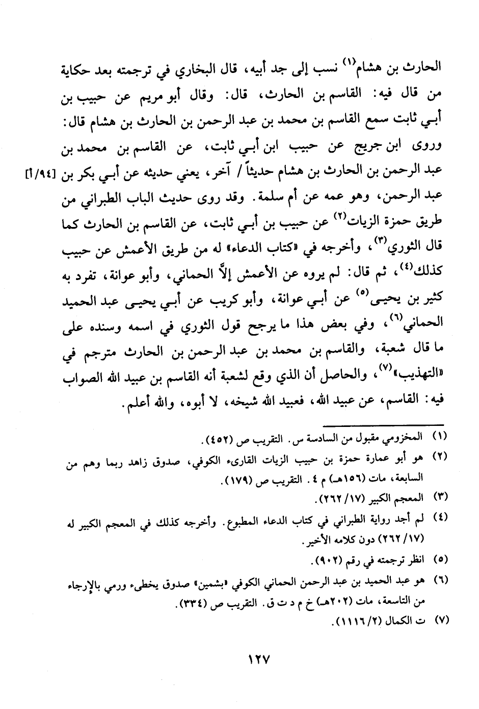 الْحَارِث بن هِشَام نسب إِلَى جد أَبِيه قَالَ البُخَارِيّ فِي تَرْجَمته بعد حِكَايَة من قَالَ فِيهِ الْقَاسِم بن الْحَارِث قَالَ وَقَالَ أَبُو مَرْيَم عَن حبيب بن أبي ثَابت سمع الْقَاسِم بن مُحَمَّد بن عبد الرَّحْمَن بن الْحَارِث بن هِشَام قَالَ وروى بن جريج عَن حبيب بن أبي ثَابت عَن الْقَاسِم بن مُحَمَّد بن عبد الرَّحْمَن بن الْحَارِث بن هِشَام حَدِيثا آخر يَعْنِي حَدِيثه عَن أبي بكر بن عبد الرَّحْمَن وَهُوَ عَمه عَن أم سَلمَة وَقد روى حَدِيث الْبَاب الطَّبَرَانِيّ من طَرِيق حَمْزَة الزيات عَن حبيب بن أبي ثَابت عَن الْقَاسِم بن الْحَارِث كَمَا قَالَ الثَّوْريّ وَأخرجه فِي كتاب الدُّعَاء لَهُ من طَرِيق الْأَعْمَش عَن حبيب كَذَلِك ثمَّ قَالَ لم يروه عَن الْأَعْمَش إِلَّا الْحمانِي وَأَبُو عوَانَة تفرد بِهِ كثير بن بَحر عَن أبي عوَانَة وَأَبُو كريب عَن أبي يحيى عبد الحميد الْحمانِي وَفِي بعض هَذَا مَا يرجح قَول الثَّوْريّ فِي اسْمه وَسَنَده على مَا قَالَ شُعْبَة وَالقَاسِم بن مُحَمَّد بن عبد الرَّحْمَن بن الْحَارِث مترجم فِي التَّهْذِيب وَالْحَاصِل أَن الَّذِي وَقع لشعبة أَنه الْقَاسِم بن عبيد الله الصَّوَاب فِيهِ الْقَاسِم عَن عبيد الله فعبيد الله شَيْخه لَا أَبوهُ وَالله أعلم
