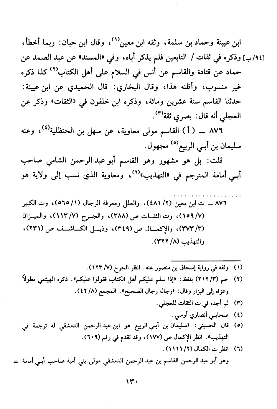 877 - االْقَاسِم مولى مُعَاوِيَة عَن سهل بن الحنظلية وَعنهُ سُلَيْمَان بن أبي الرّبيع مَجْهُول قلت بل هُوَ مَشْهُور وَهُوَ الْقَاسِم بن عبد الرَّحْمَن الشَّامي صَاحب أبي أُمَامَة المترجم فِي التَّهْذِيب وَمُعَاوِيَة الَّذِي نسب إِلَى ولَايَة هُوَ