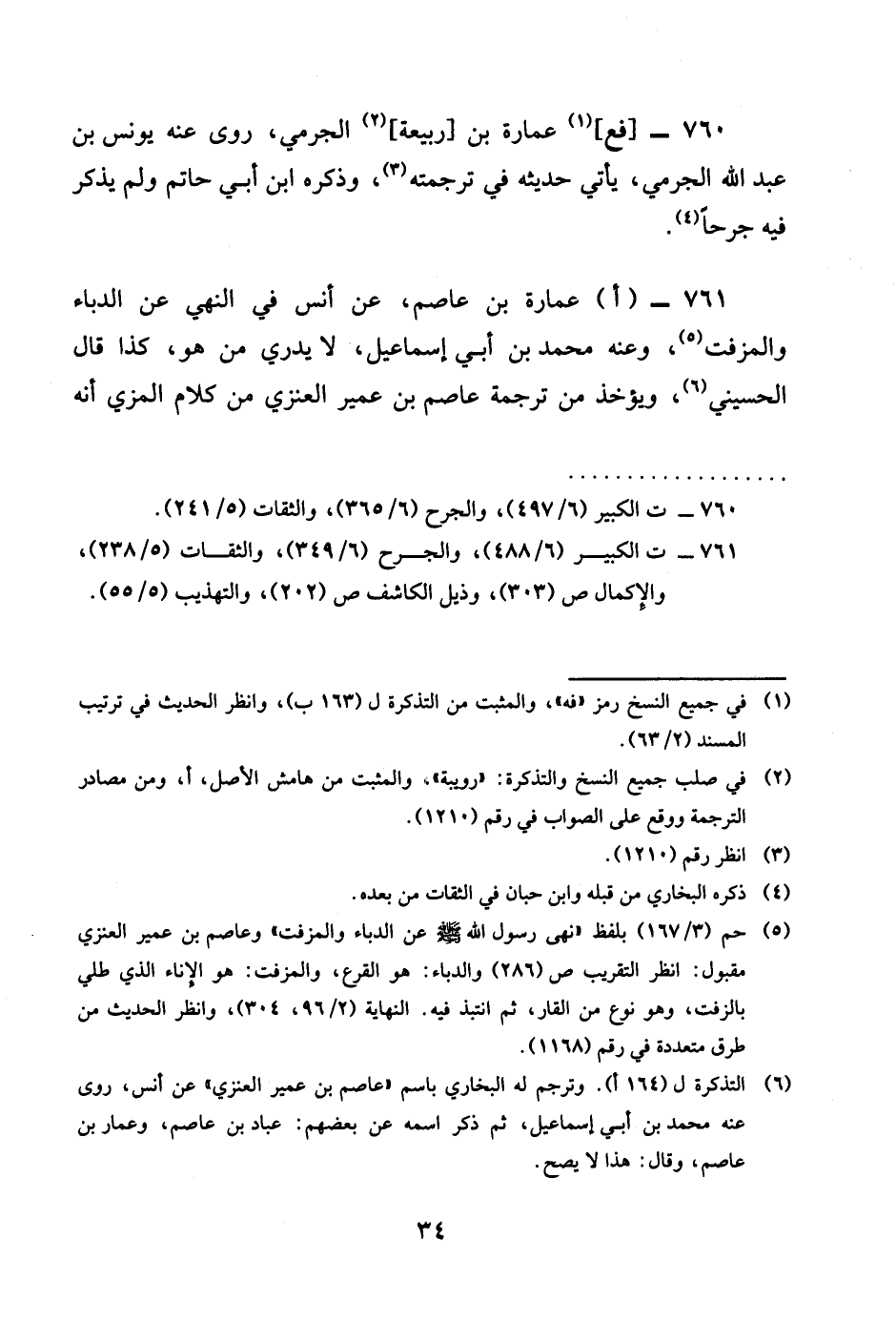 763 - اعمَارَة بن عَاصِم عَن أنس فِي النَّهْي عَن الدُّبَّاء والمزفت وَعنهُ مُحَمَّد بن أبي إِسْمَاعِيل لَا يدْرِي من هُوَ كَذَا قَالَ الْحُسَيْنِي وَيُؤْخَذ من تَرْجَمَة عَاصِم بن عُمَيْر الْعَنزي من كَلَام الْمزي أَنه