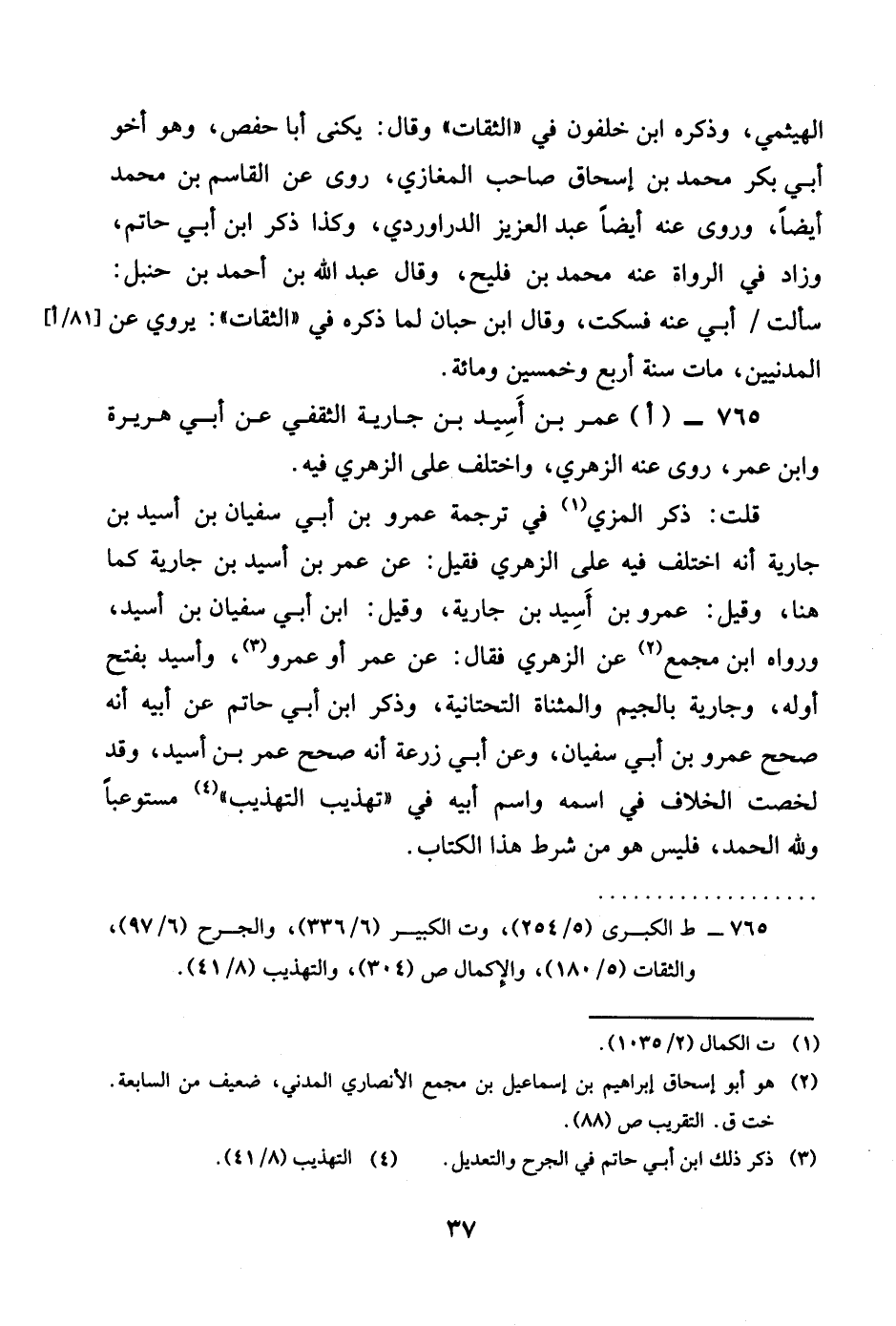 767 - اعمر بن أسيد بن جَارِيَة الثَّقَفِيّ عَن أبي هُرَيْرَة وَابْن عمر رضى الله تَعَالَى عَنْهُم روى عَنهُ الزُّهْرِيّ وَاخْتلف على الزُّهْرِيّ فِيهِ قلت ذكر الْمزي فِي تَرْجَمَة عَمْرو بن أبي سُفْيَان بن أسيد بن حَارِثَة أَنه اخْتلف فِيهِ على الزُّهْرِيّ فَقيل عَن عمر بنأسيد بن جَارِيَة كَمَا هُنَا وَقيل عَمْرو بن أسيد بن جَارِيَة وَقيل بن أبي سُفْيَان بن أسيد وَرَوَاهُ بن مجمع عَن الزُّهْرِيّ فَقَالَ عَن عمر أَو عَمْرو وَأسيد بِفَتْح أَوله وَجَارِيَة بِالْجِيم والمثناة التَّحْتَانِيَّة وَذكر بن أبي حَاتِم عَن أَبِيه أَنه صحّح عَمْرو بن أبي سُفْيَان وَعَن أبي زرْعَة أَنه صحّح عمر بن أسيد وَقد لخصت الْخلاف فِي اسْمه وَاسم أَبِيه فِي تَهْذِيب التَّهْذِيب مستوعبا وَللَّه الْحَمد فَلَيْسَ هُوَ من شَرط هَذَا الْكتاب